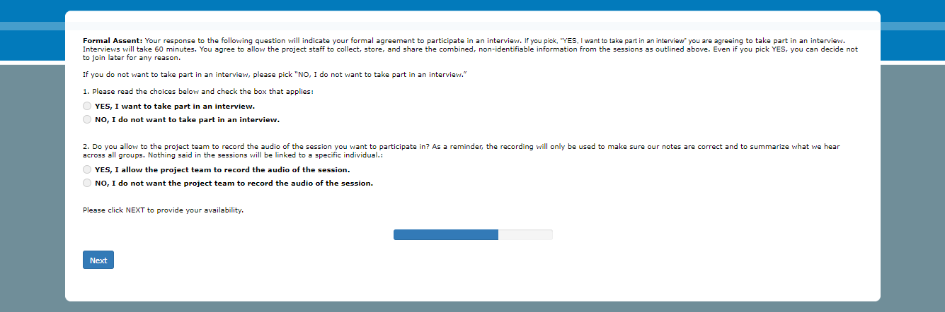 Formal Assent: Your response to the following question will indicate your formal agreement to participate in an interview. If you pick, “YES, I want to take part in an interview” you are agreeing to take part in an interview. Interviews will take 60 minutes. You agree to allow the project staff to collect, store, and share the combined, non-identifiable information from the sessions as outlined above. Even if you pick YES, you can decide not to join later for any reason.