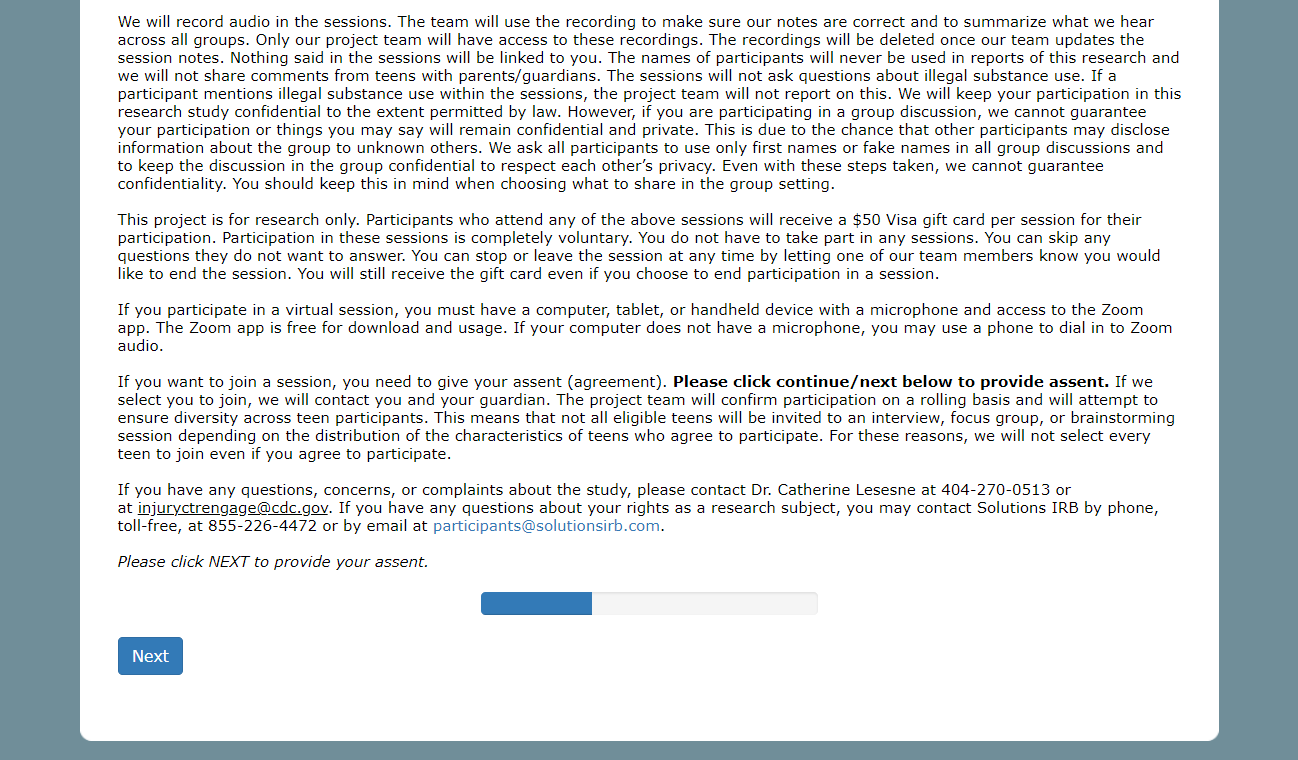 If you have any questions, concerns, or complaints about the study, please contact Dr. Catherine Lesesne at 404-270-0513 or at injuryctrengage@cdc.gov. If you have any questions about your rights as a research subject, you may contact Solutions IRB by phone, toll-free, at 855-226-4472 or by email at participants@solutionsirb.com.