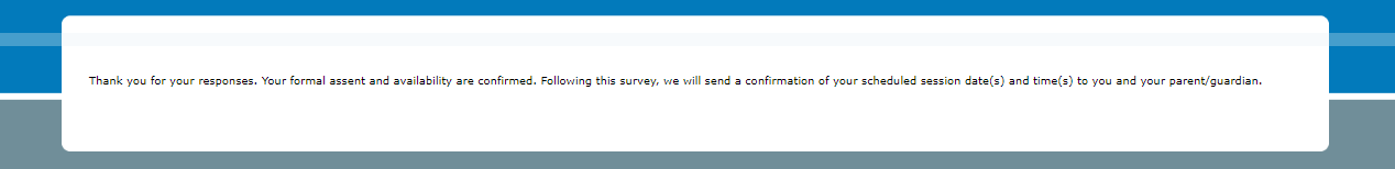 If you want to join a session, you need to give your assent (agreement). Please click continue/next below to provide assent. If we select you to join, we will contact you and your guardian. The project team will confirm participation on a rolling basis and will attempt to ensure diversity across teen participants. This means that not all eligible teens will be invited to an interview, focus group, or brainstorming session depending on the distribution of the characteristics of teens who agree to participate. For these reasons, we will not select every teen to join even if you agree to participate.