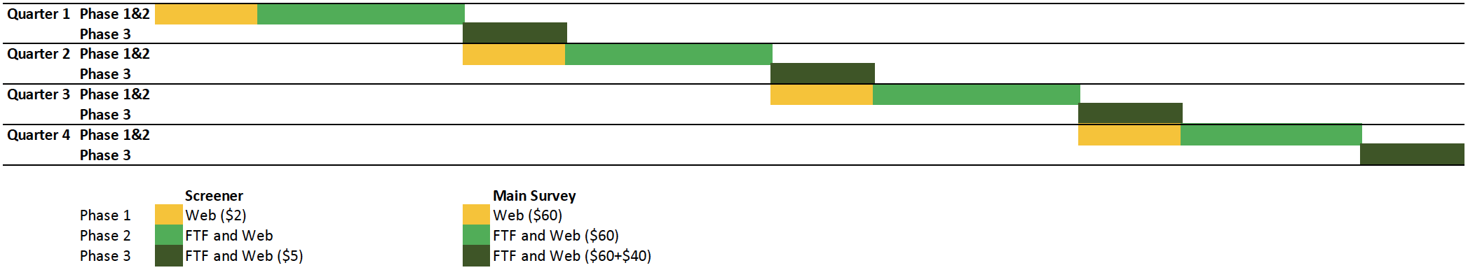 In our prior reinstatement request, we planned to conduct an experiment to compare the multimode design (web-mode surveys with face-to-face follow-up) with a design involving only face-to-face mode (comparable to prior NSFGs). This experiment was planned for the first 2 quarters of 2022, with only the multimode design to be implemented thereafter. Due to the barriers caused by the COVID-19 pandemic, as well as ongoing challenges for recruiting and retaining sufficient numbers of field interviewers, this experiment could not occur as planned, and may not be possible until Quarters 3 and 4 of 2024, conditional on sufficient interviewer staffing prior to Quarter 3 to produce the minimum necessary FTF interviews for the experiment. The sections on sampling stages and the data collection steps below will therefore focus on the multimode design, and the mode experiment details and evaluation can be found in section 4, “Tests of Procedures or Methods to be Undertaken.”