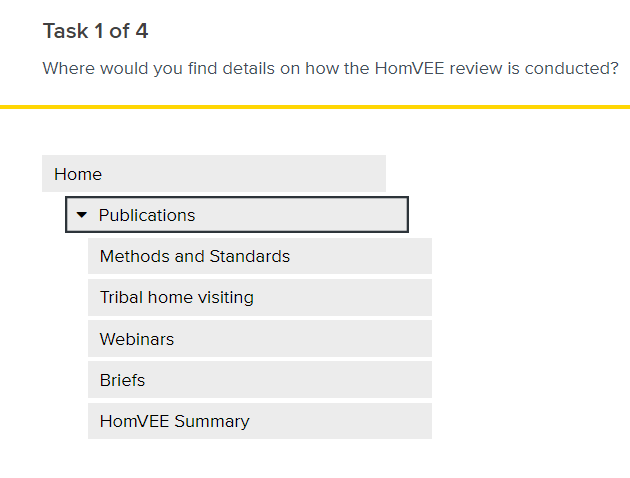 This document describes our plan for testing the Home Visiting Evidence of Effectiveness (HomVEE) website’s Information Architecture to discover issues impacting the usability of the site.