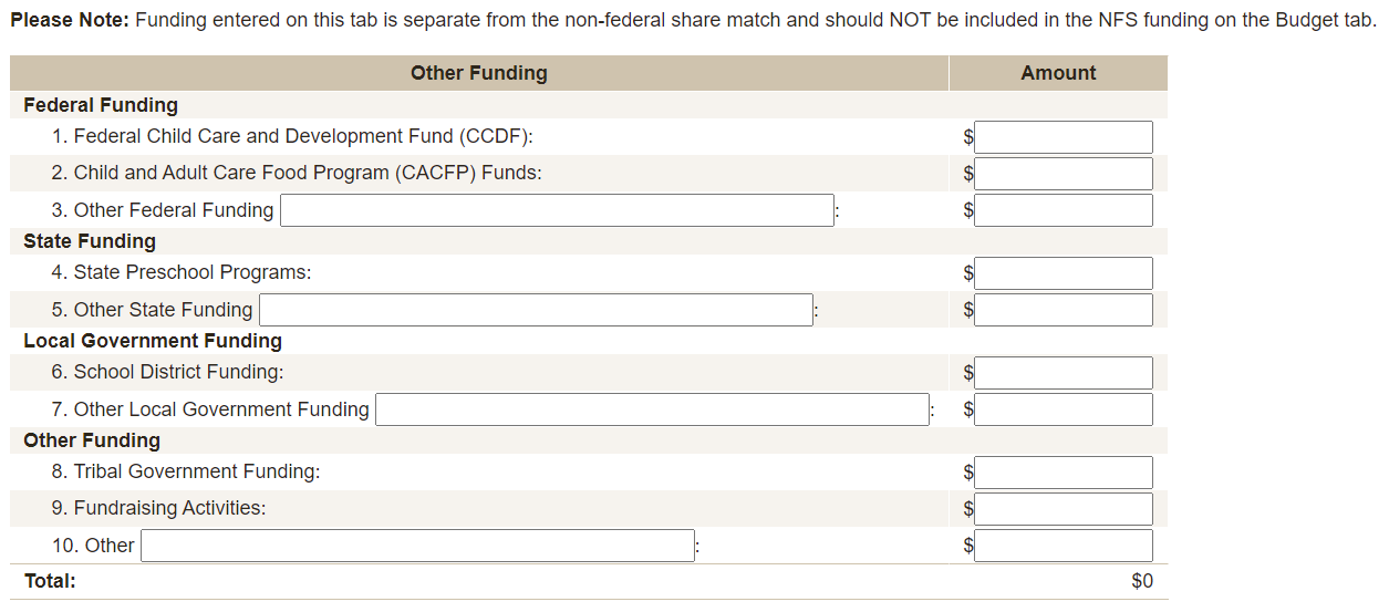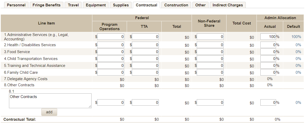 Budget: Enter each partnership contract for direct services to children and families under the “Contractual” budget category tab, line “8. Other Contracts.” For each recipient or delegate budget, enter an individual financial line item in the budget for each contract over $250,000 and briefly explain the services to be provided. For any single line-item costing more than $250,000 in the “Other” budget category, please enter an individual financial line item. Applications with consolidated amounts will be returned for correction.
