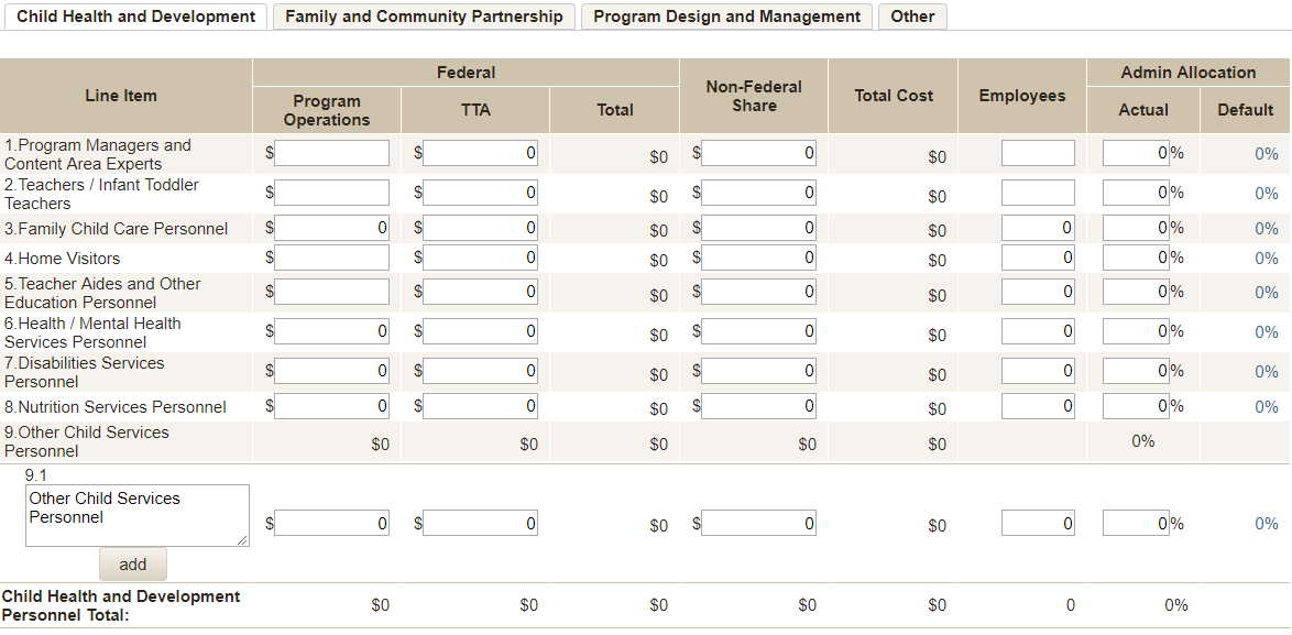 Budget: A comprehensive budget aligns with the proposed program approach and identifies allowable costs and is aggregated by object class budget category. Separate projected budgets for Head Start and Early Head Start by grant and by delegate must be completed.