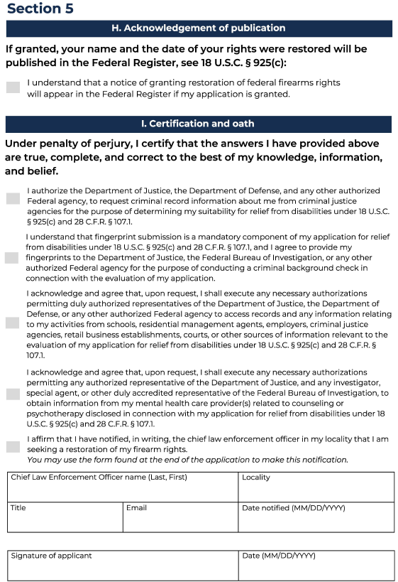 U.S.C. § 925(c) and 28 C.F.R. § 107.1 to determine whether restoration of federal firearms rights should be issued. The routine uses of this information include making determinations on eligibility. Information will also be disclosed to other Federal, State, foreign, and local law enforcement and regulatory agencies to verify information provided on the application. [TBD]. You must provide the requested information to apply for a restoration of your rights. Failure to do so will result in a denial and an inability to process the application. Solicitation of your social security number is made pursuant to 78 U.S.C. § 925(c), and E.O. 9397, and it will be used to verify your identity. If granted, your name, address, court of conviction, and date of conviction will be published in the Federal Register, as required by 78 U.S.C. § 925(c). You must consent to this disclosure in order to apply for restoration of your federal firearms rights.