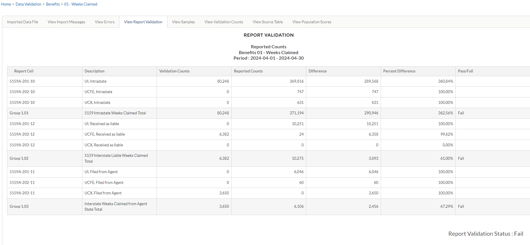 * The ETA 539, Weekly Claims Activity Report, is not validated. However, states are strongly encouraged to compare the total claims reported on the 539 to the 5159 report for the same period to determine whether the counts reported are the same or within +2%. If the counts differ by more than +2%, then the state must investigate and advise its Federal regional office of its findings and what it is doing to reconcile the differences.