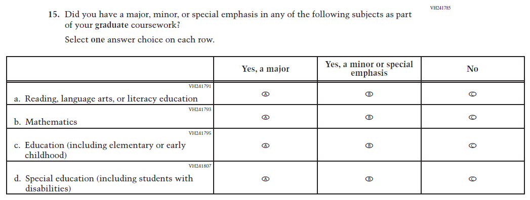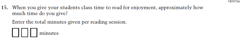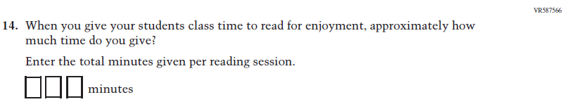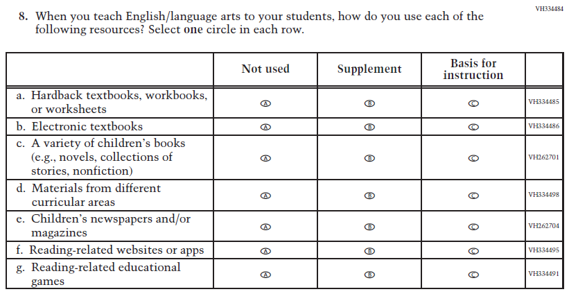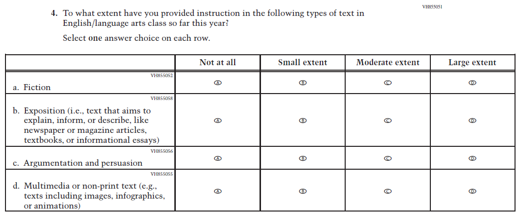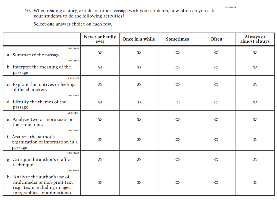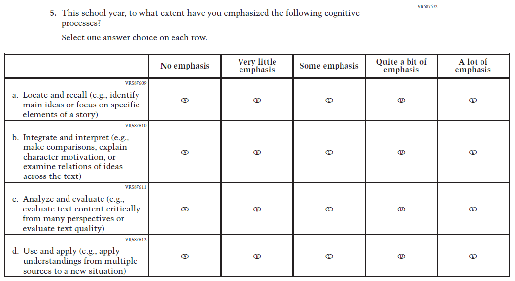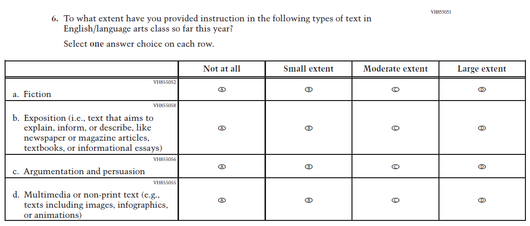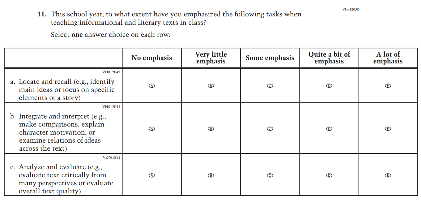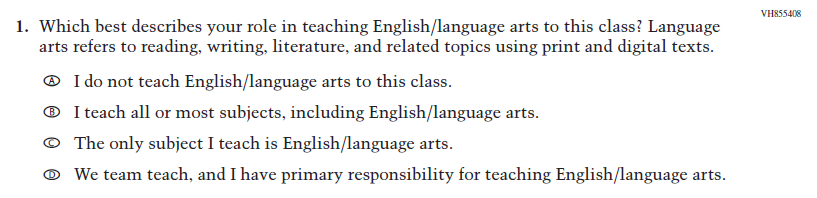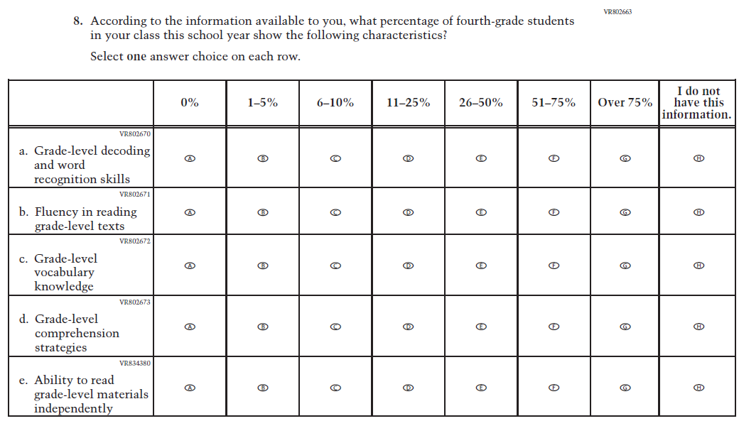 For 2026, we have aligned Inline Directions in Teacher and School Items with the Directions currently used in Student Items. Subitems a, b, c, and d were revised for clarity and subitem h was developed to measure content aligned with the new Reading framework. |
