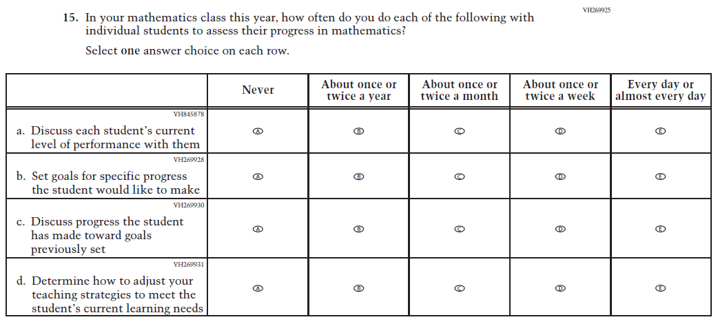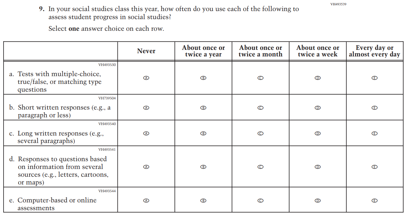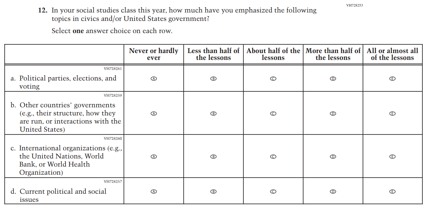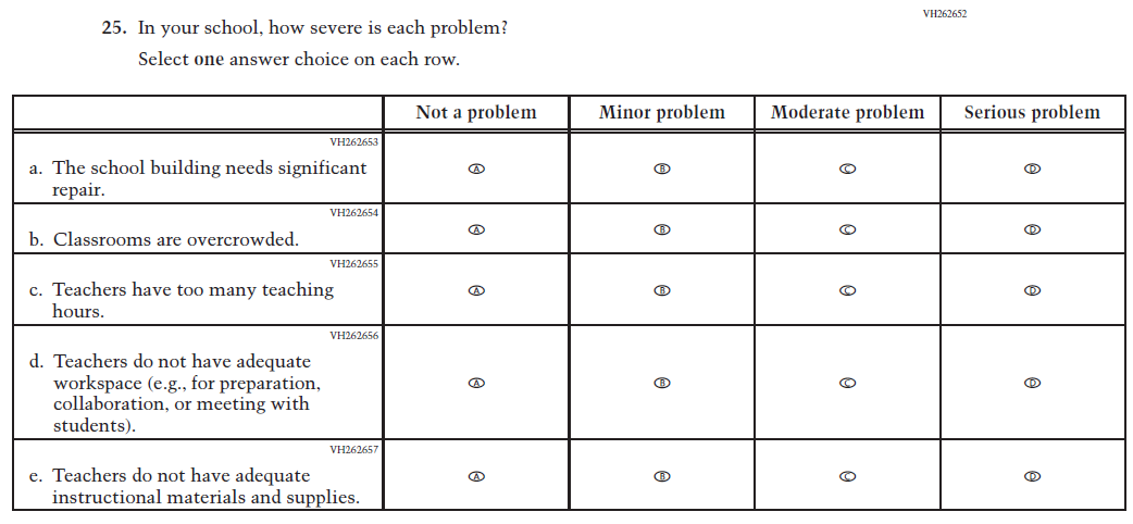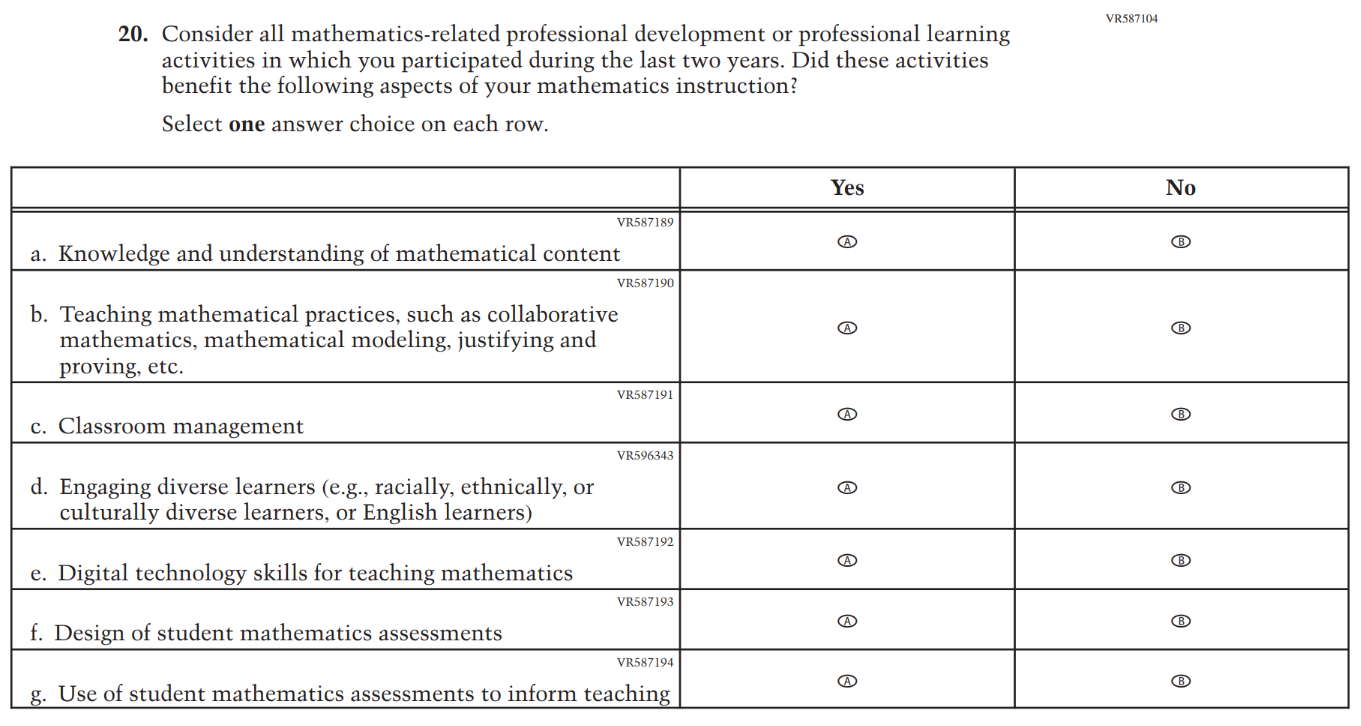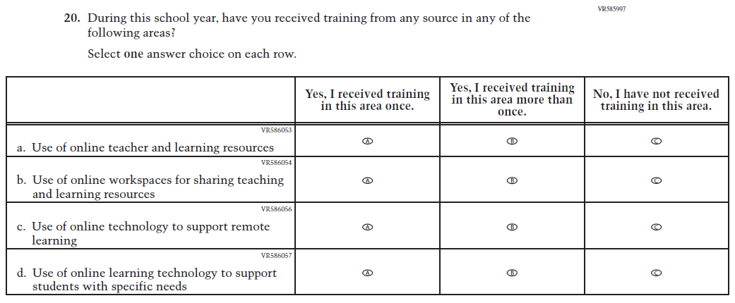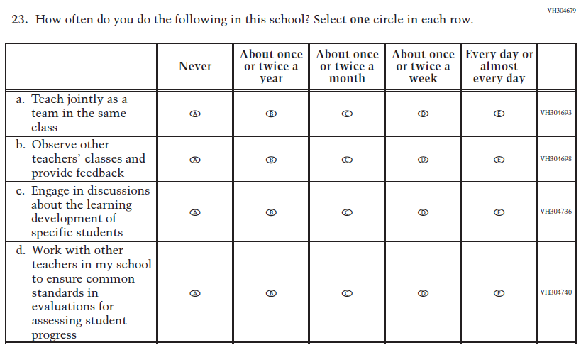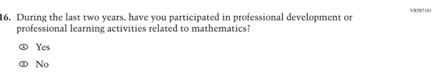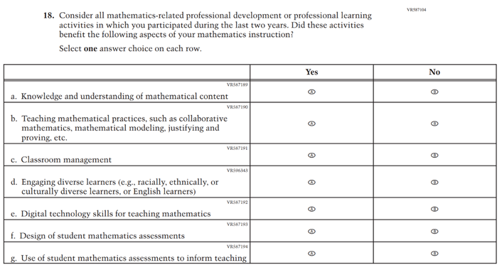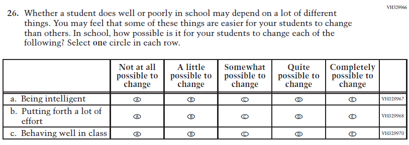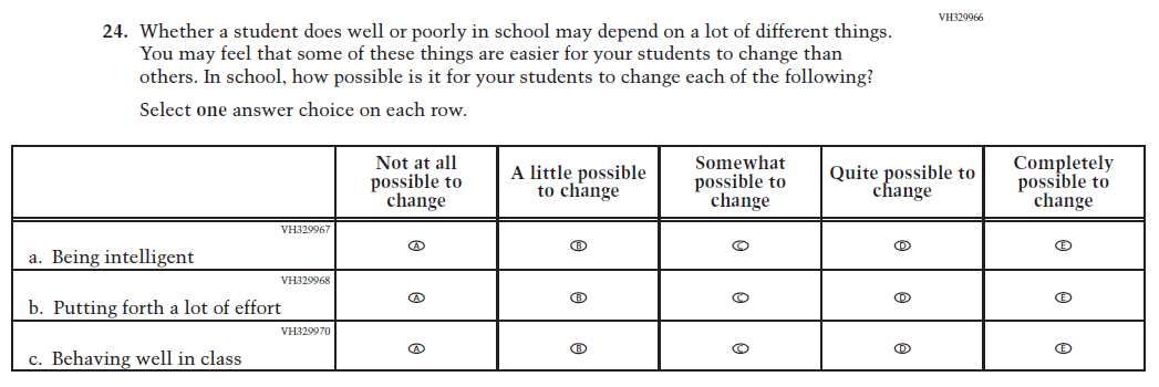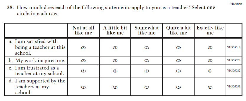 For 2026, we have aligned Inline Directions in Teacher and School Items with the Directions currently used in Student Items. The Item stem was revised for clarity and subItem d was dropped to reduce questionnaire length. |