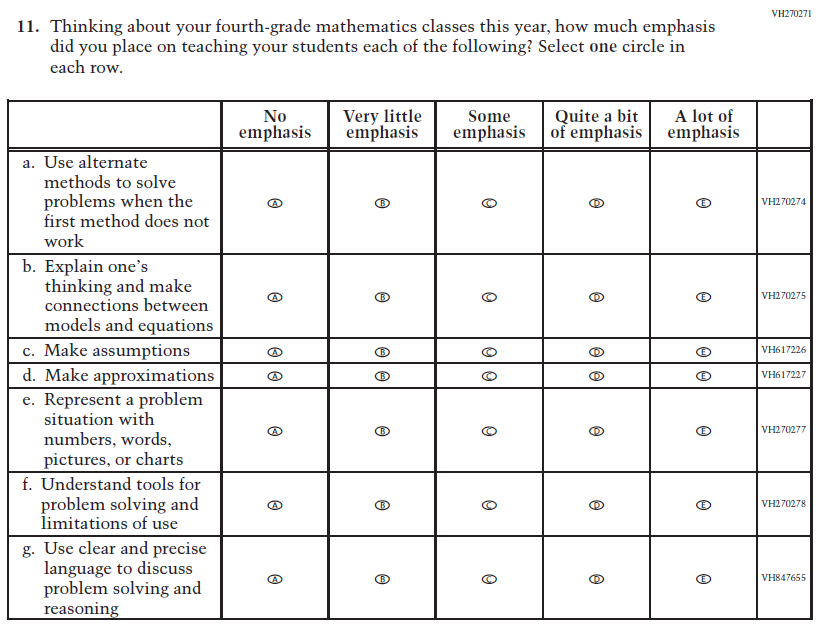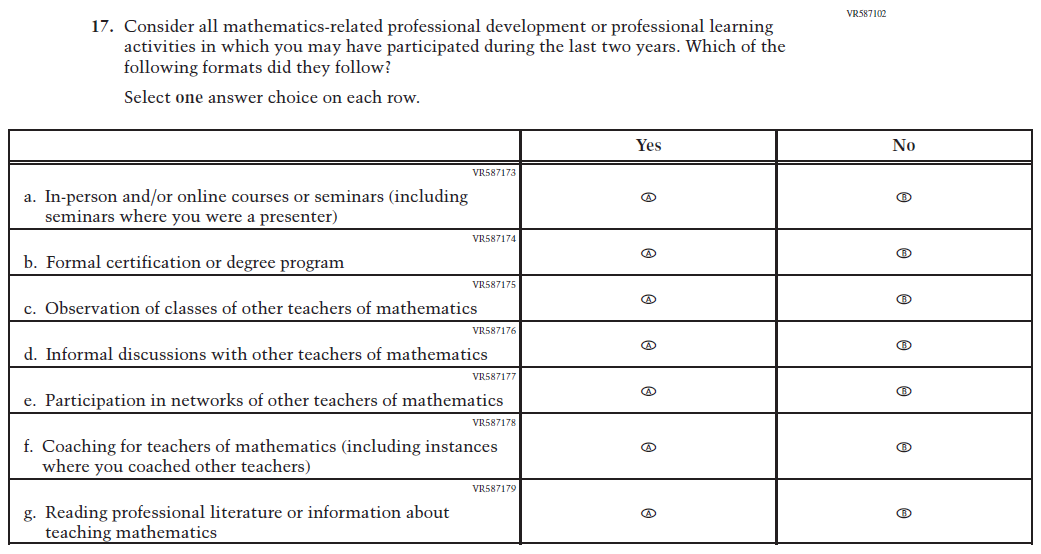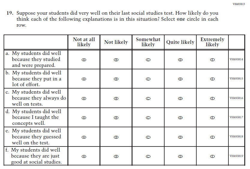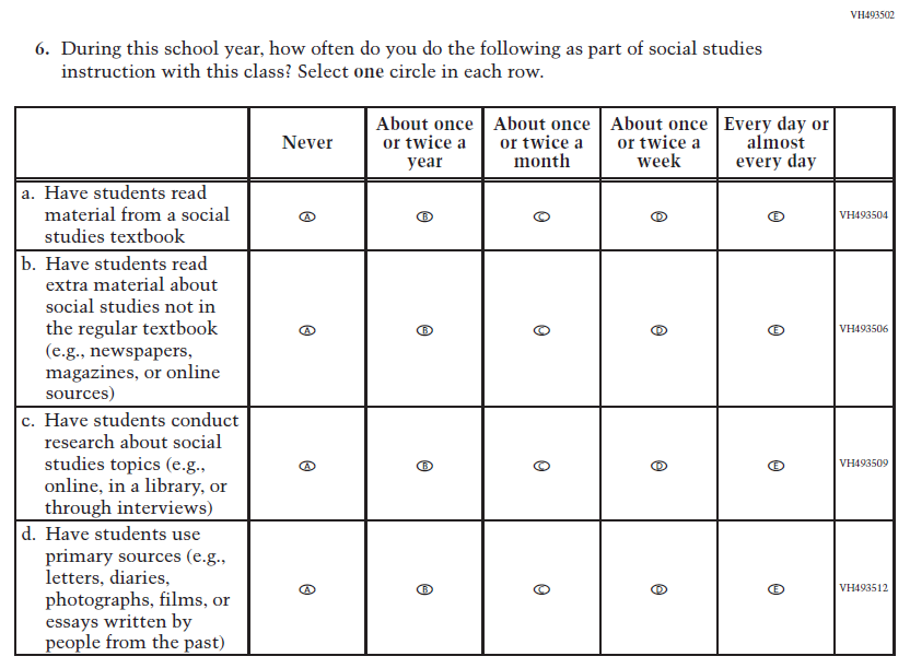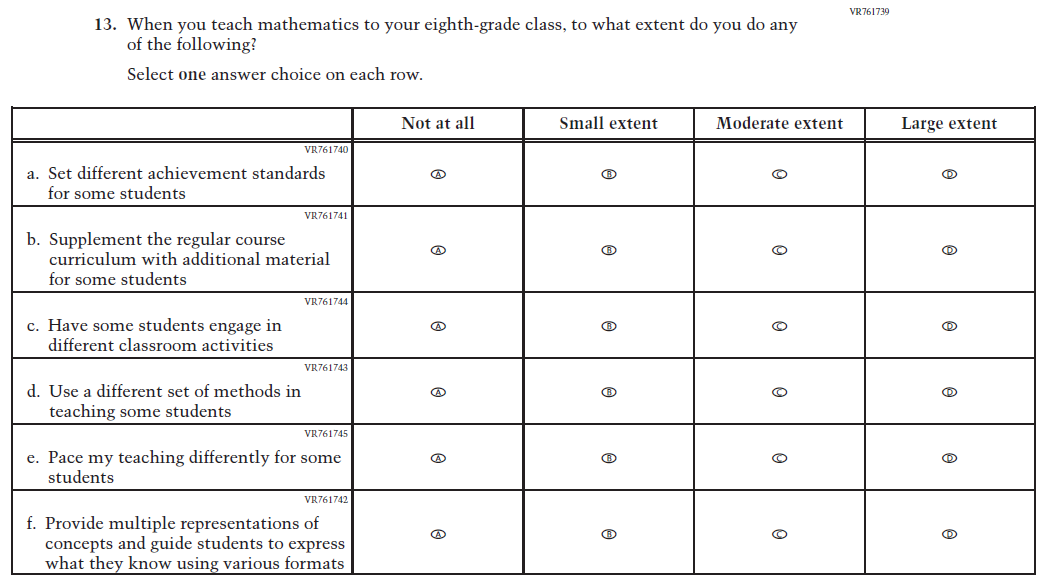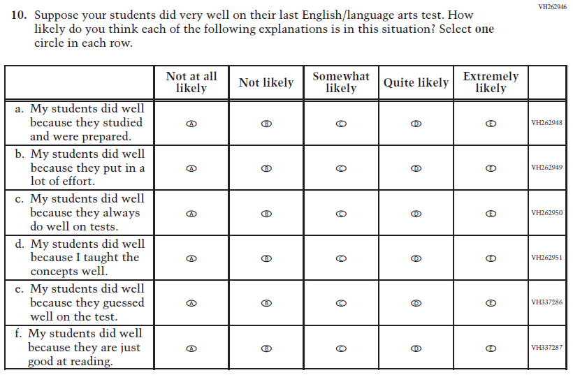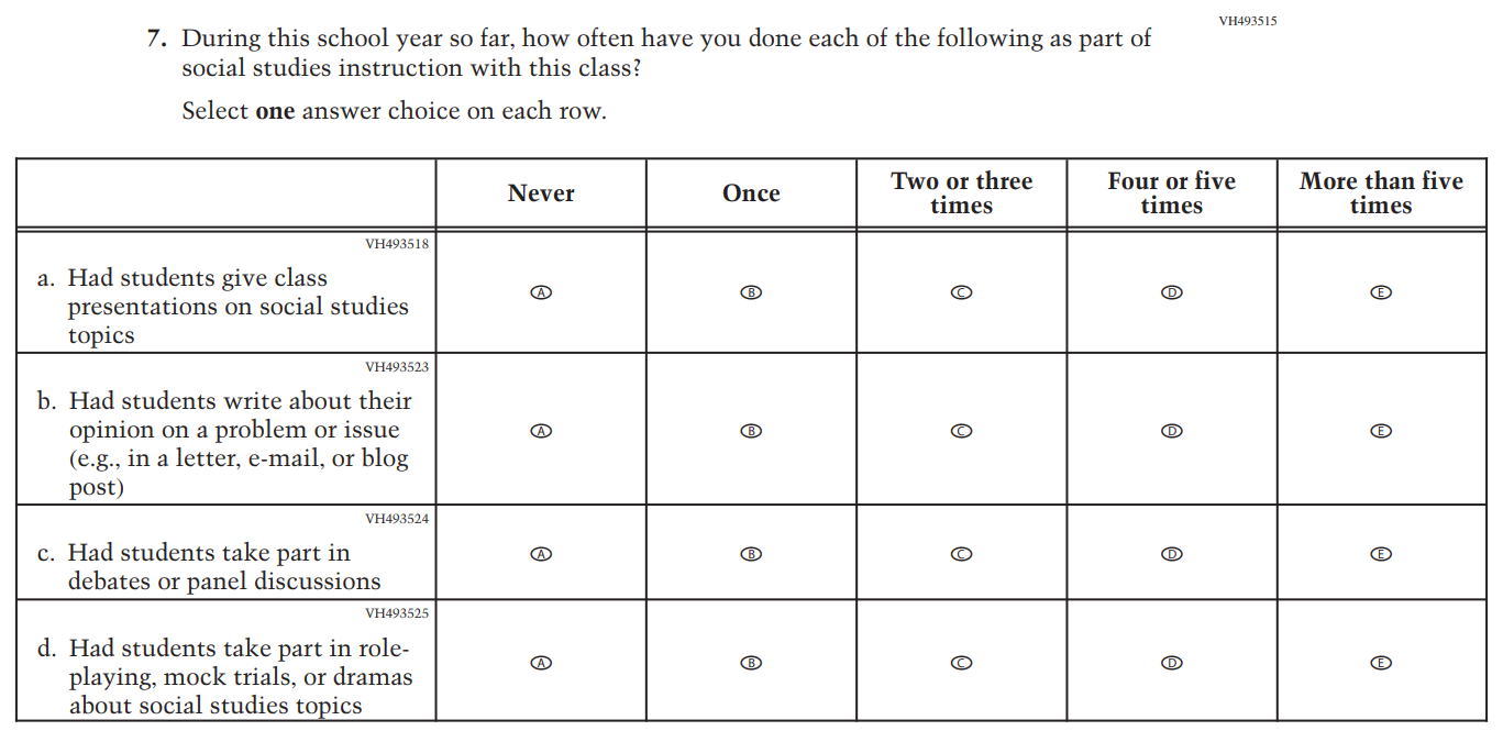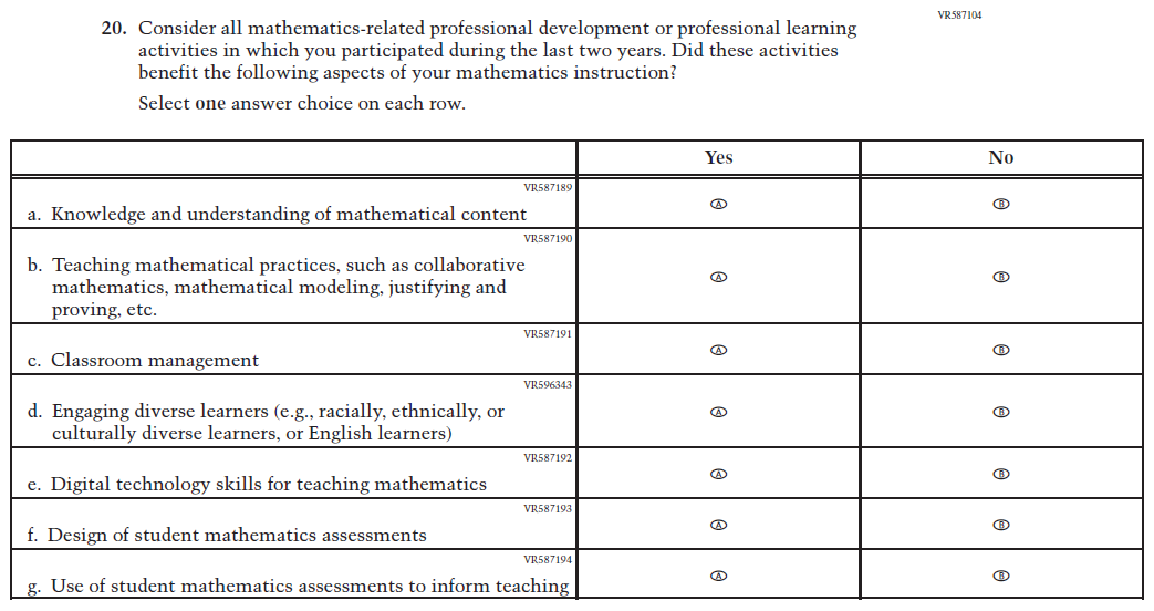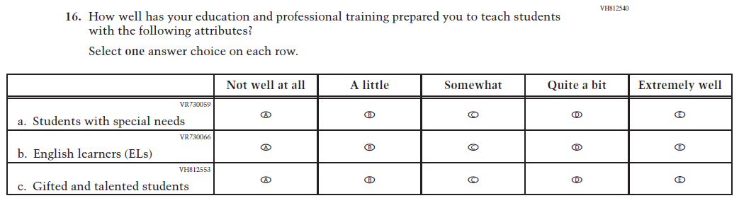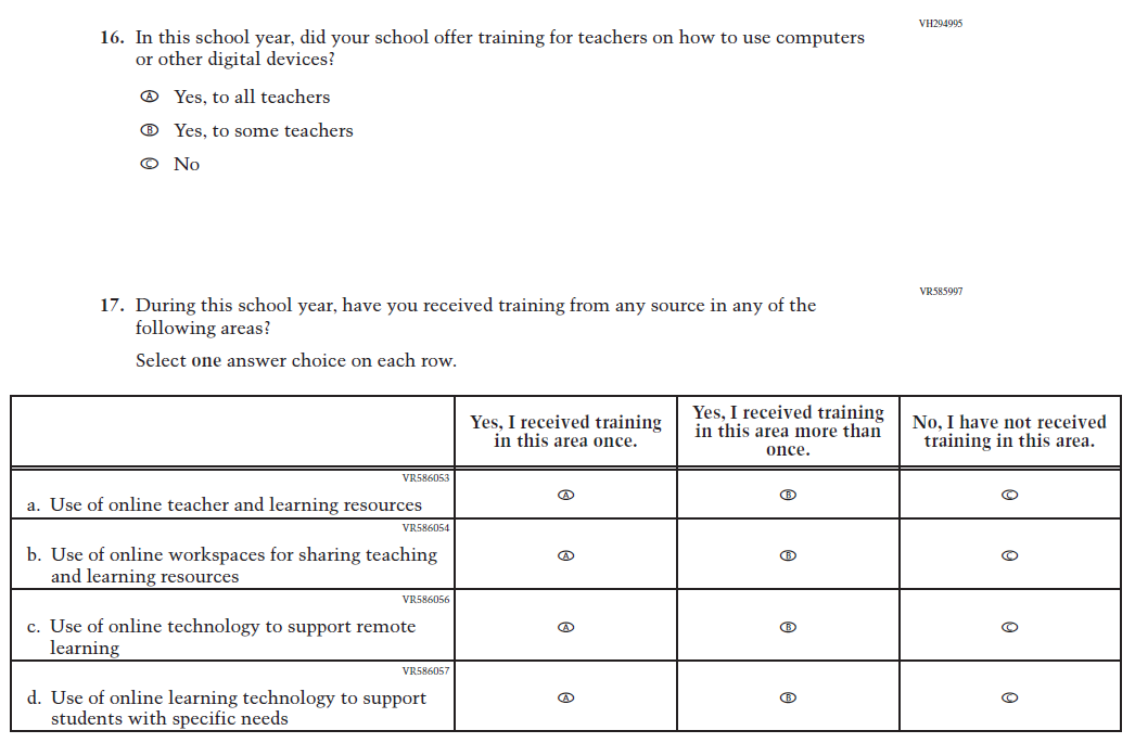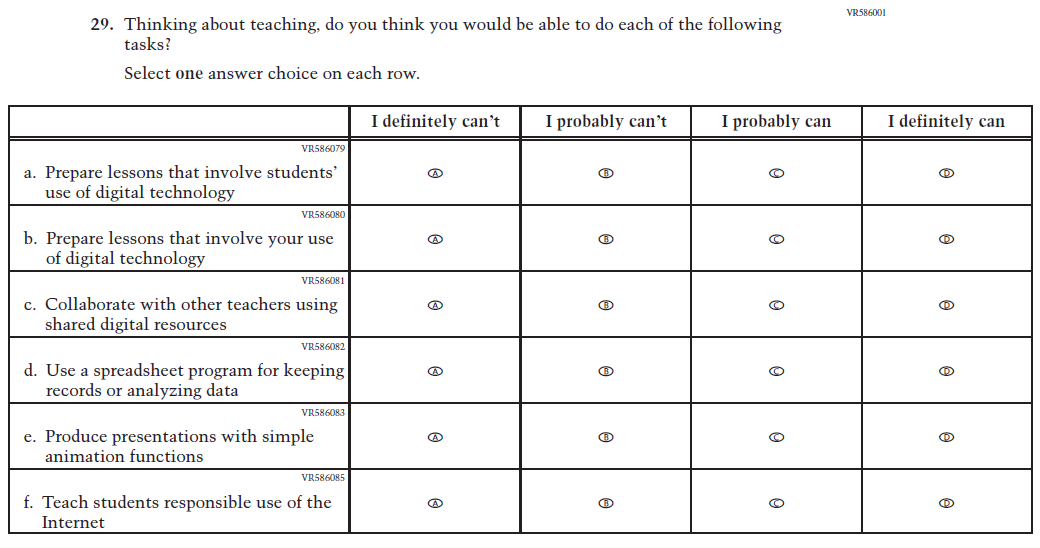 For 2026, we have aligned Inline Directions in Teacher and School Items with the Directions currently used in Student Items. The Item stem was revised for clarity and subItem d was dropped to reduce questionnaire length. |