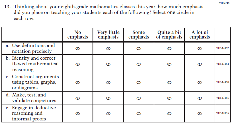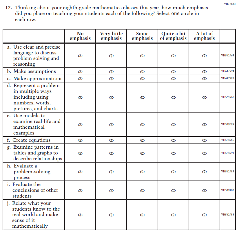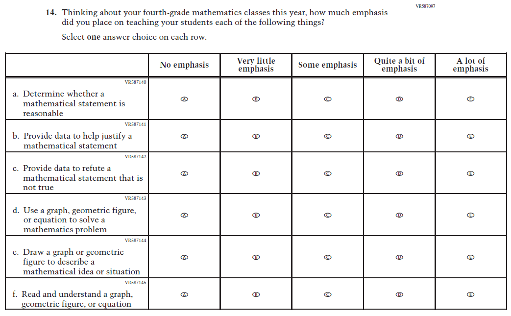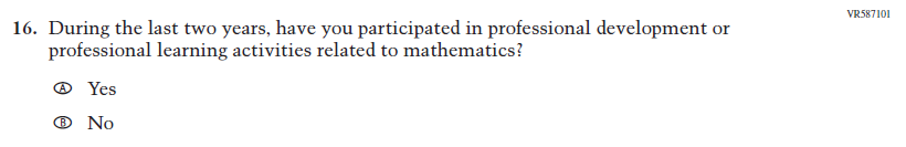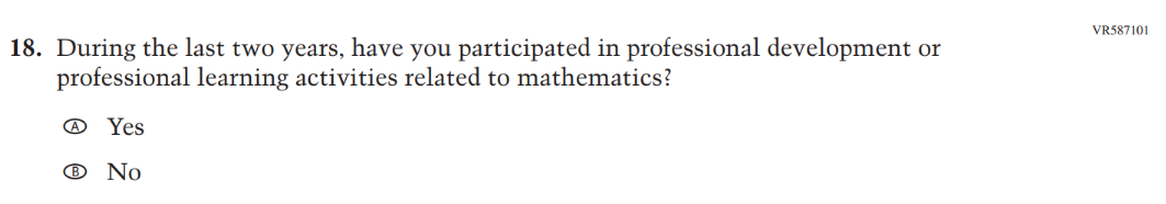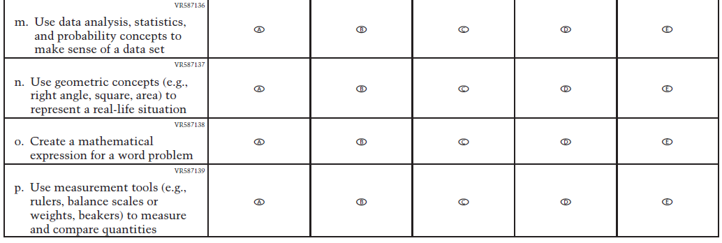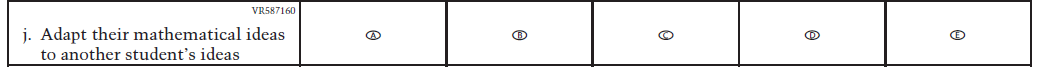 For 2026, we have aligned Inline Directions in Teacher and School Items with the Directions currently used in Student Items. The Item stem was revised for clarity and subitems k-p were developed to measure content aligned with the new Mathematics framework. |