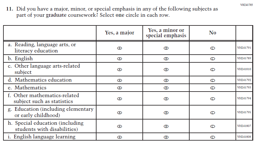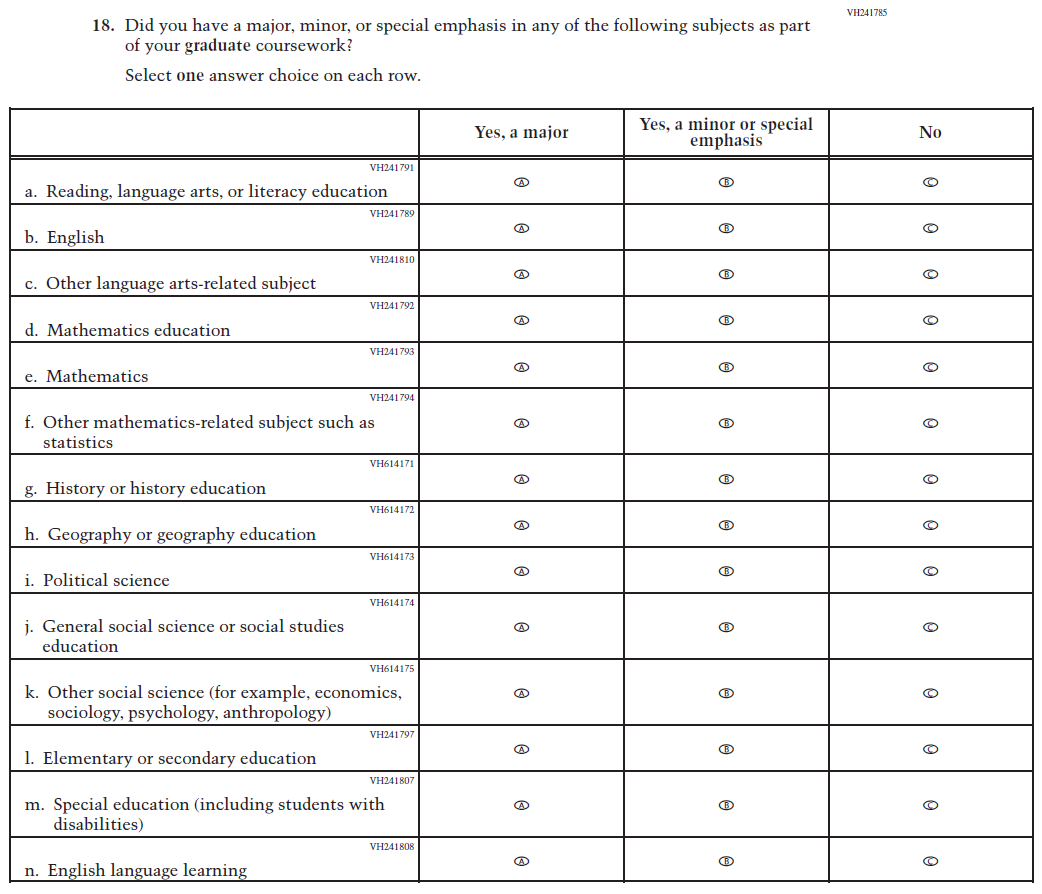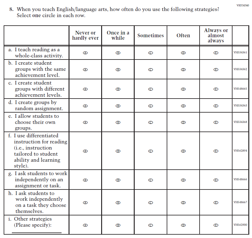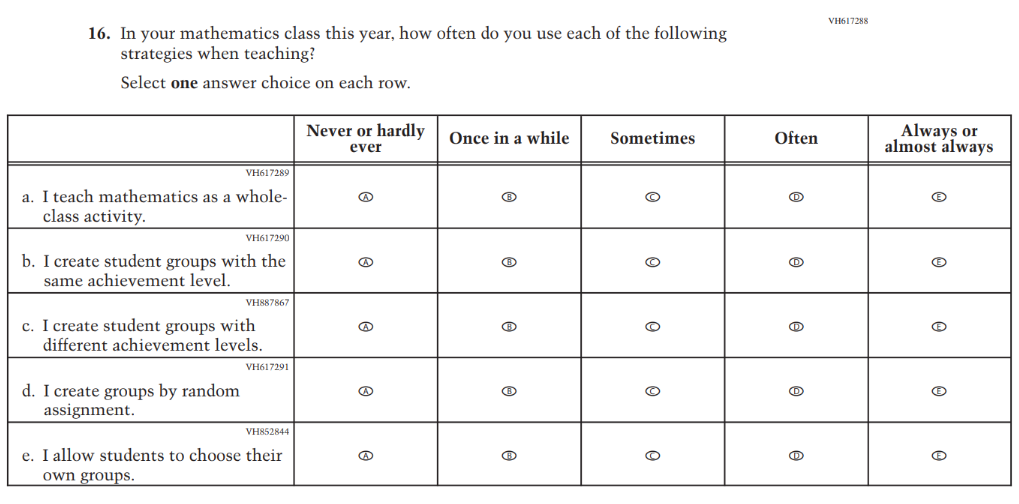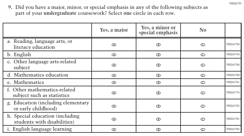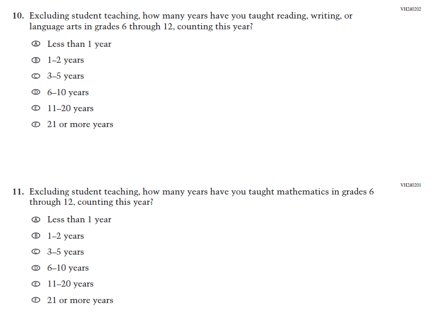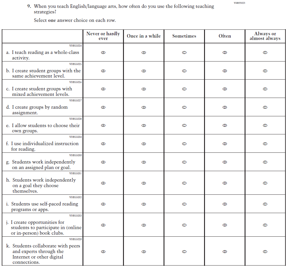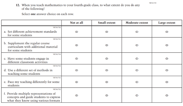 Appendix J2 provides the teacher survey questionnaires that will be administered in 2026, and any changes to the items from the 2024 administration are reflected in summary tables. Please note, some of the numbers of the items may be missing or out of order in these printed versions. This will be corrected in the platform view.
