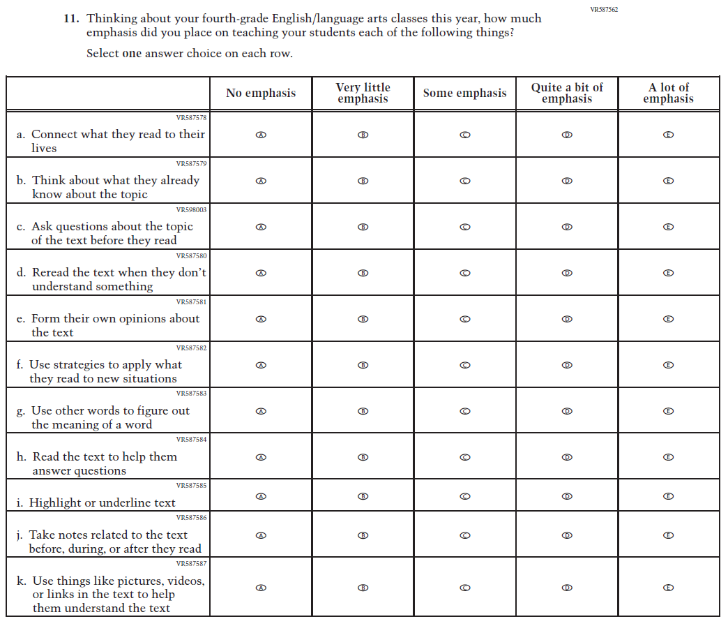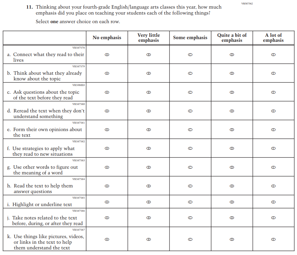 For 2026, we have aligned Inline Directions in Teacher and School Items with the Directions currently used in Student Items. Subitems c, f, g, and h were revised for clarity, and subitems i, j, and k were developed to measure content aligned with the new Reading framework. |