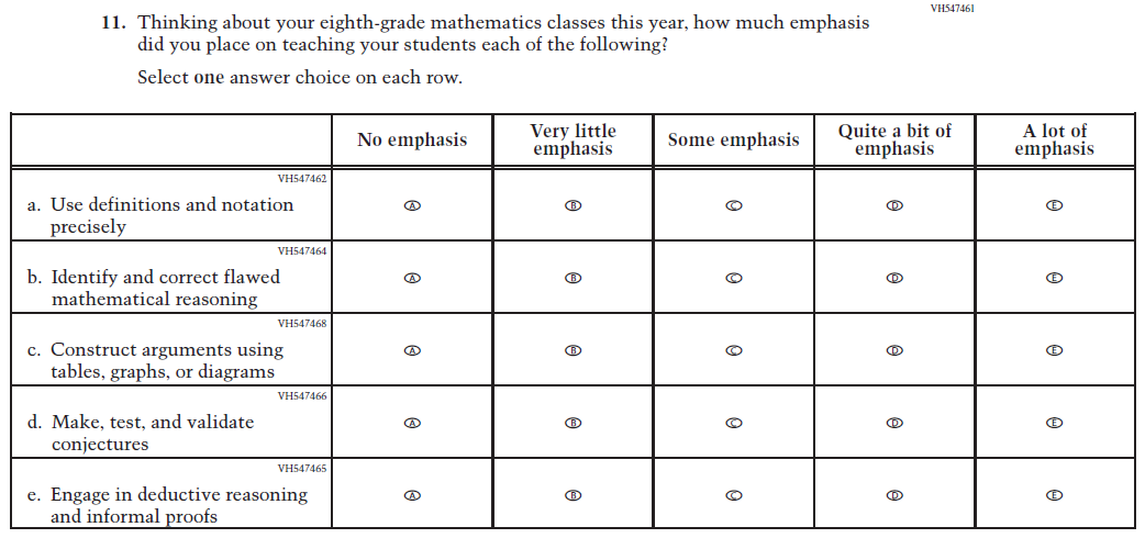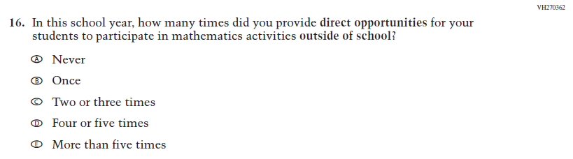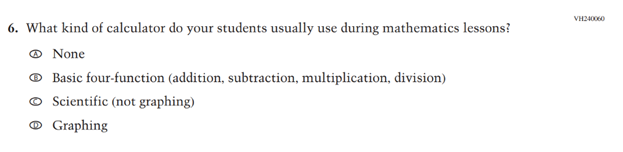 For 2026, we have aligned Inline Directions in Teacher and School Items with the Directions currently used in Student Items. The Item stem was revised for clarity, six subitems were kept, and new subitems were developed to measure content aligned with the new Mathematics framework. |