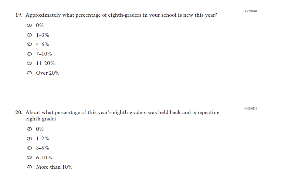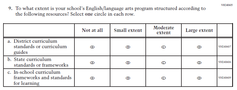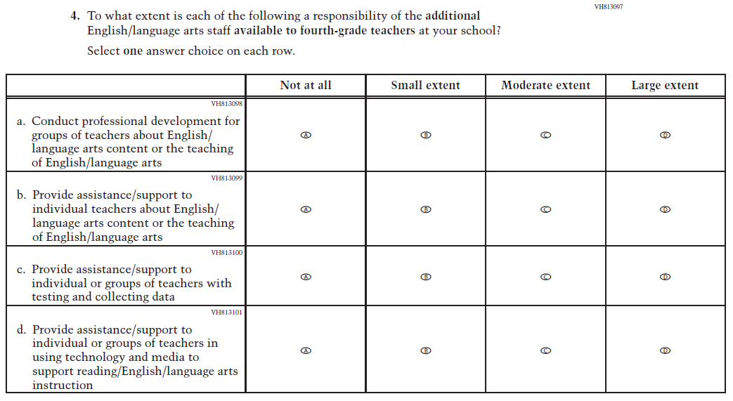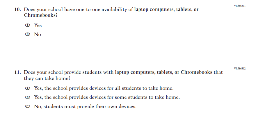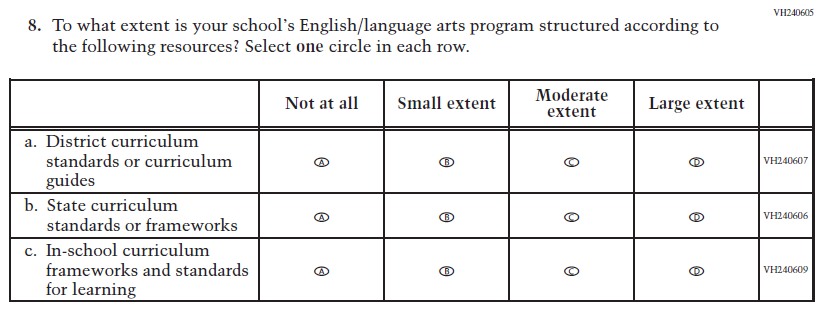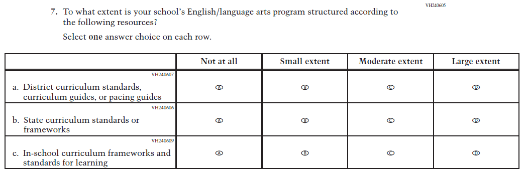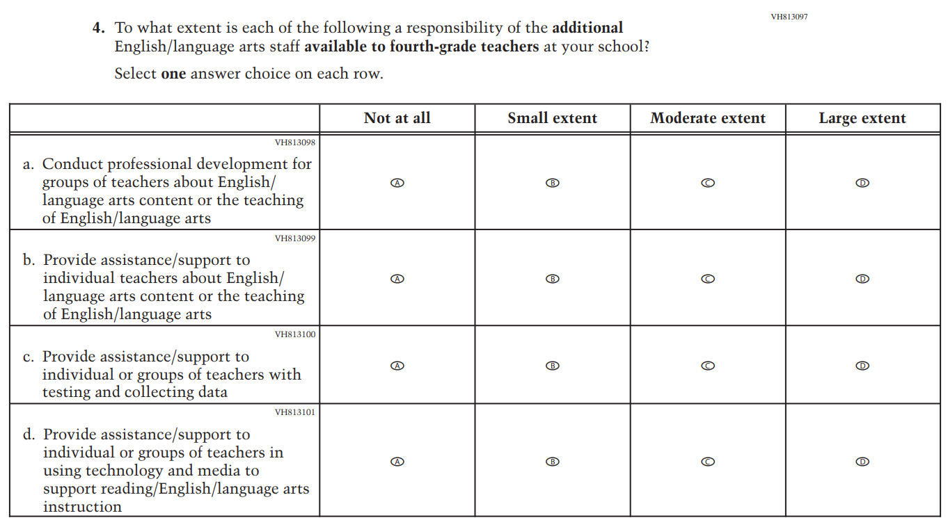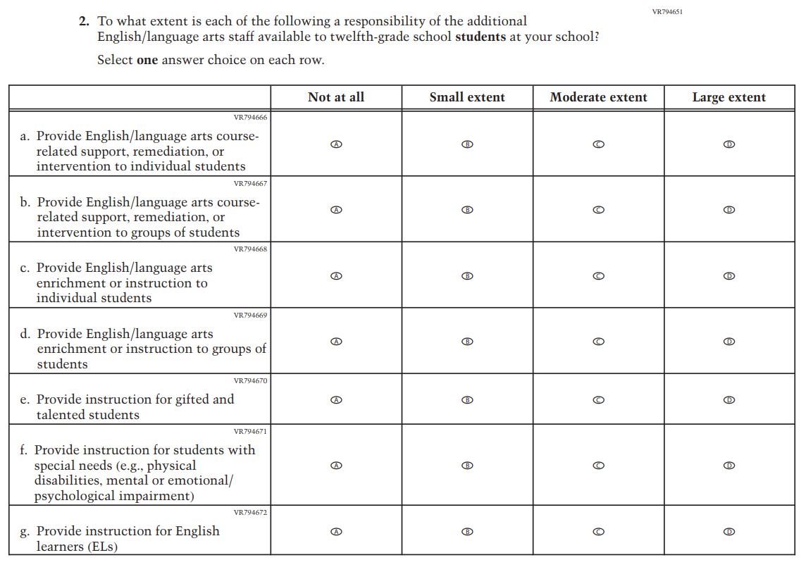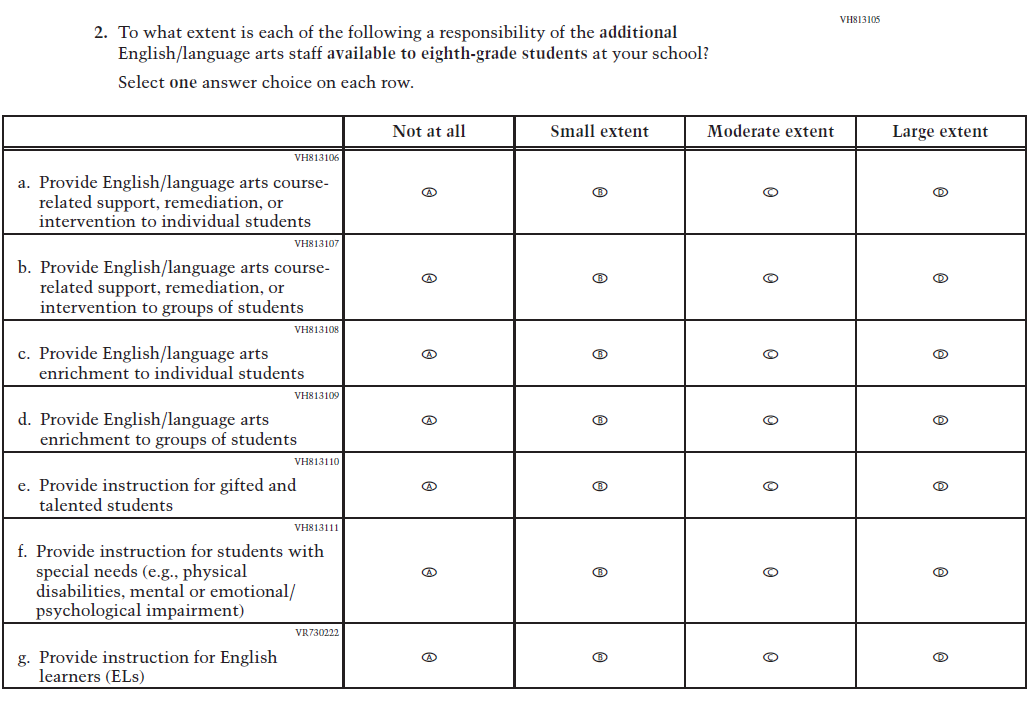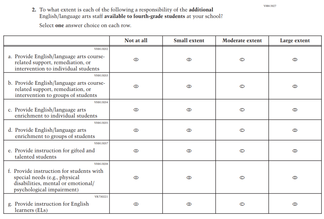 For 2026, we have aligned Inline Directions in Teacher and School Items with the Directions currently used in Student Items. Also, in SubItem g. “English-language learners” was updated to “English learners” to be consistent with other Items. |