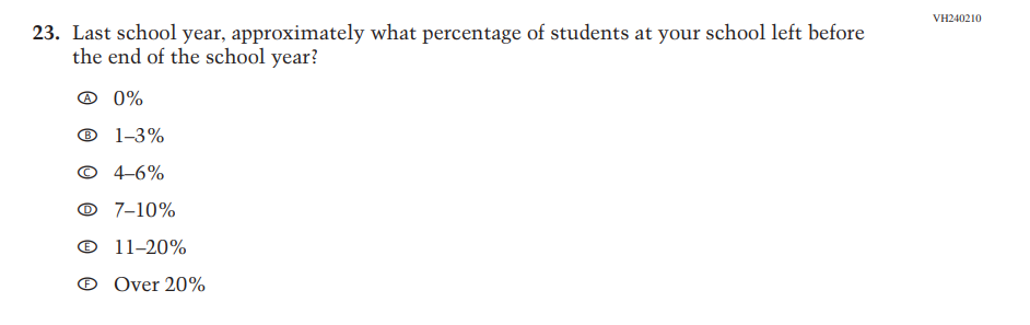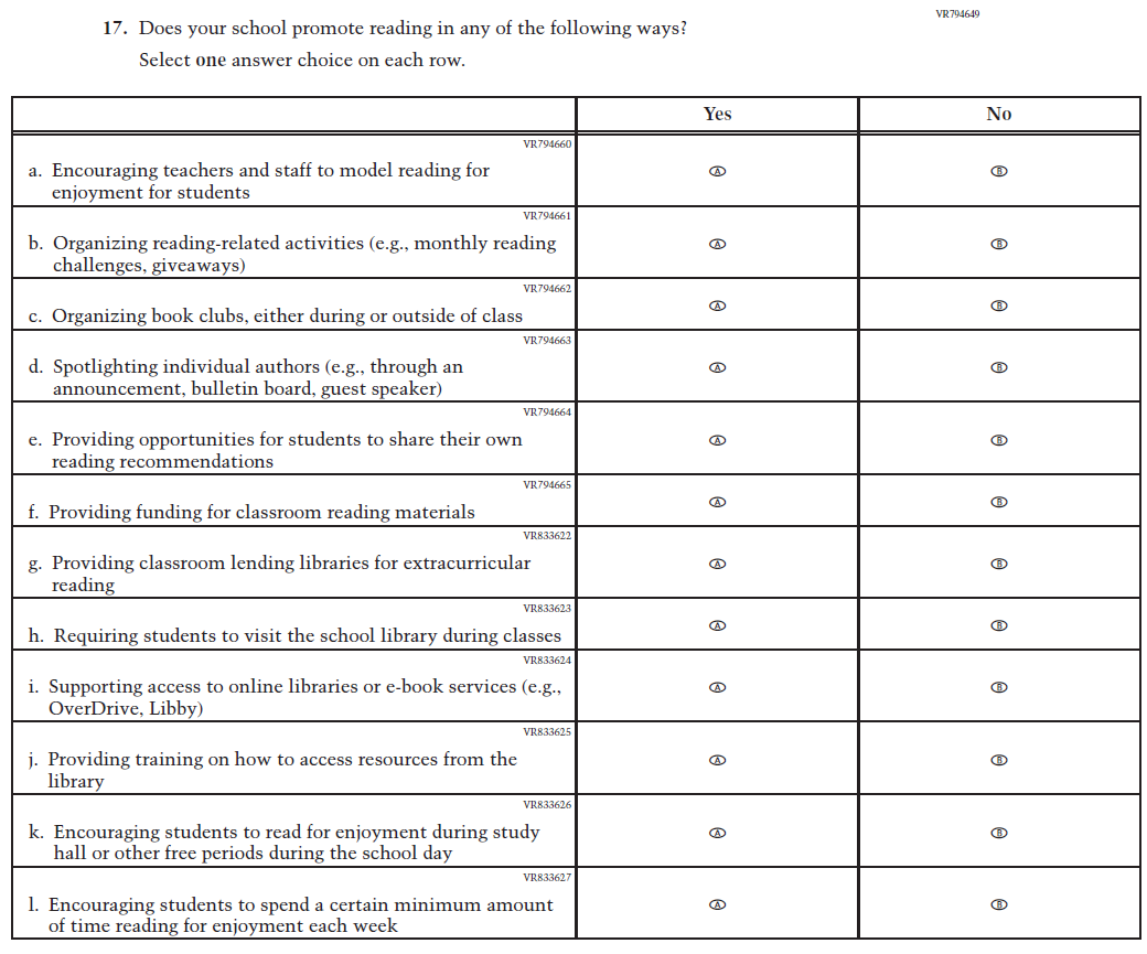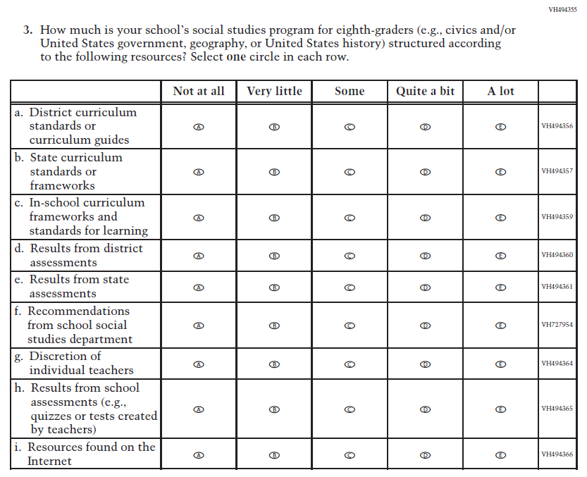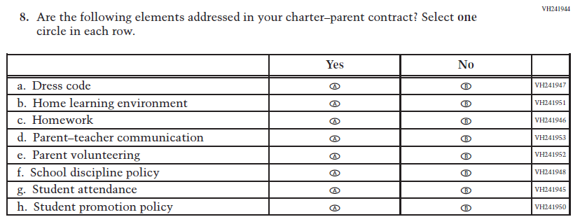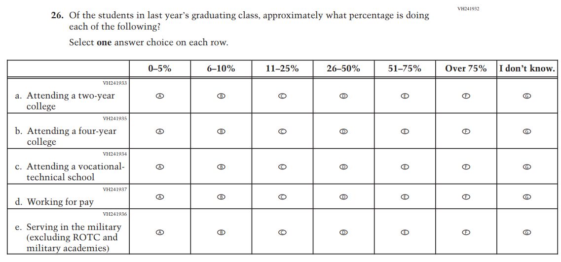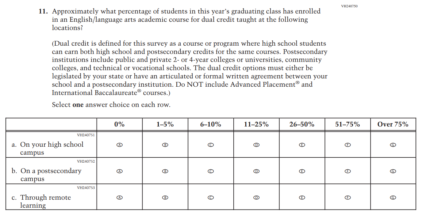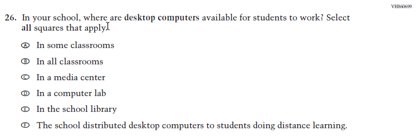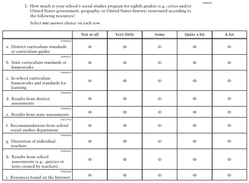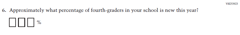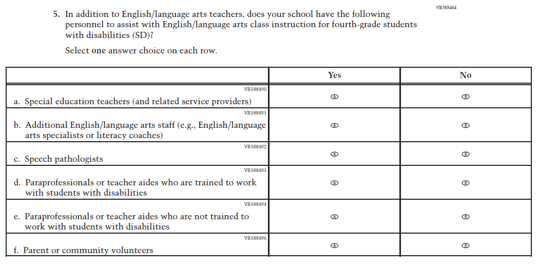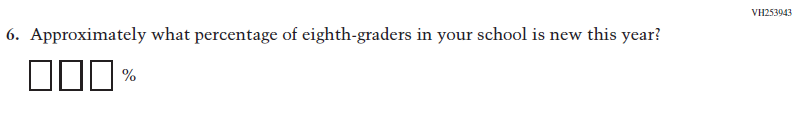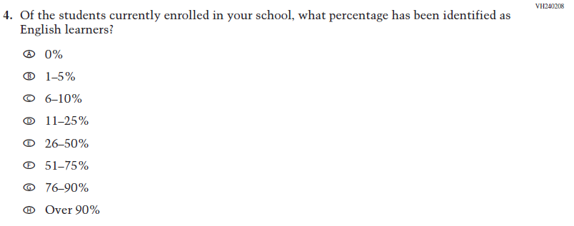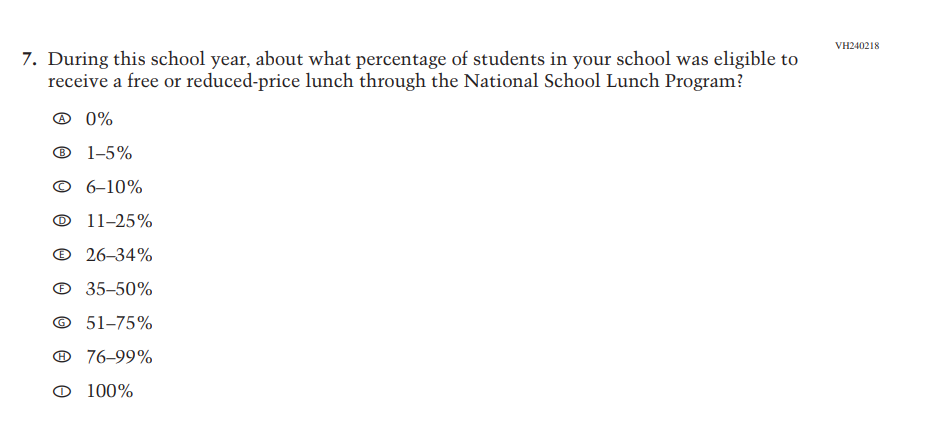 For 2026, we have aligned Inline Directions in Teacher and School Items with the Directions currently used in Student Items. Also, in SubItem g. “English-language learners” was updated to “English learners” to be consistent with other Items. |