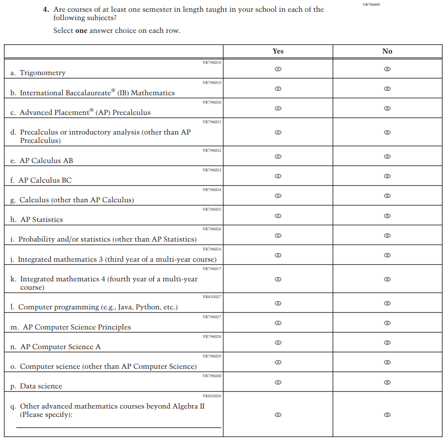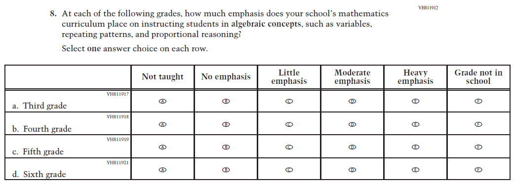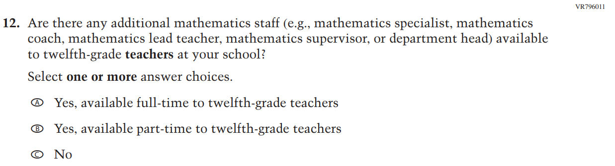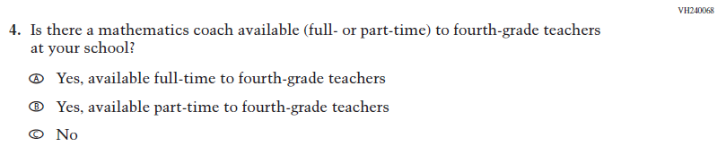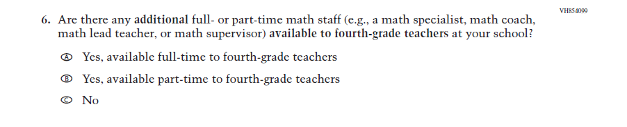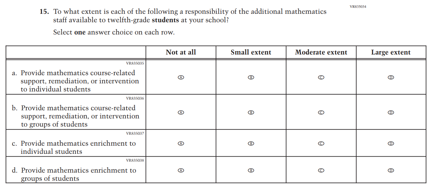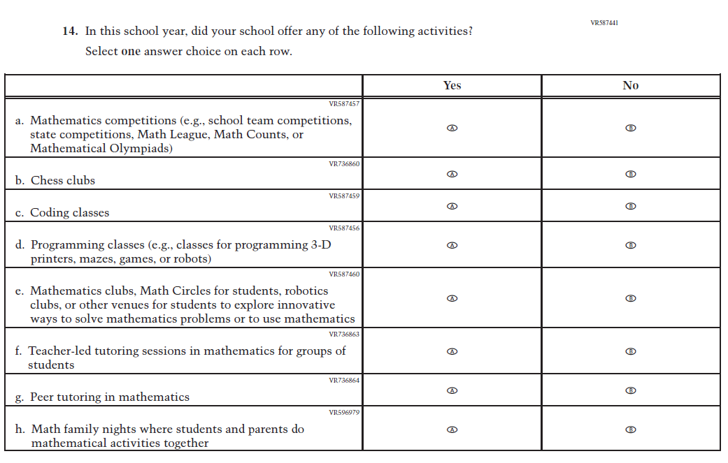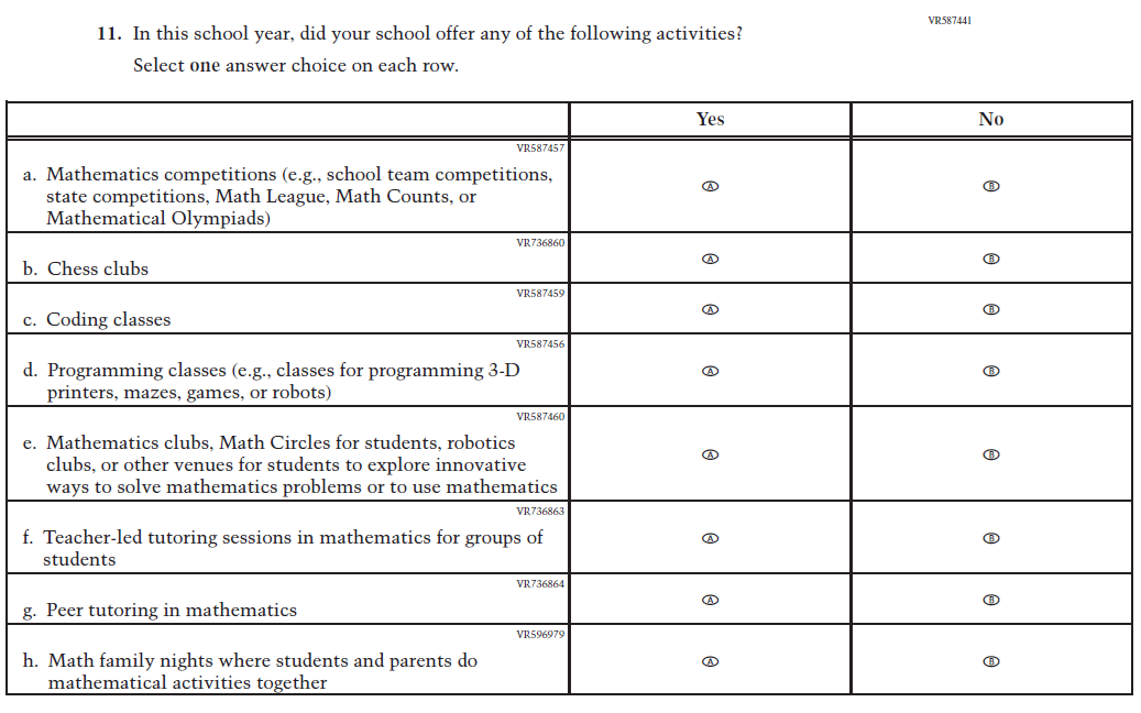 For 2026, we have aligned Inline Directions in Teacher and School Items with the Directions currently used in Student Items. Subitems a, c, and d were revised for clarity, and new subitems c and g were added to capture activities related with mathematics offered by schools. |