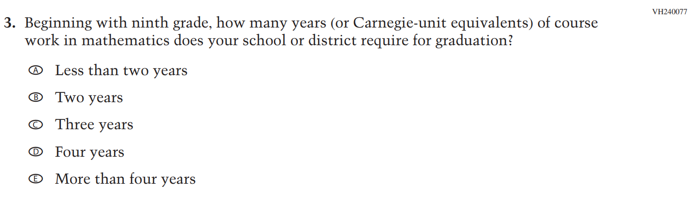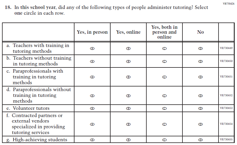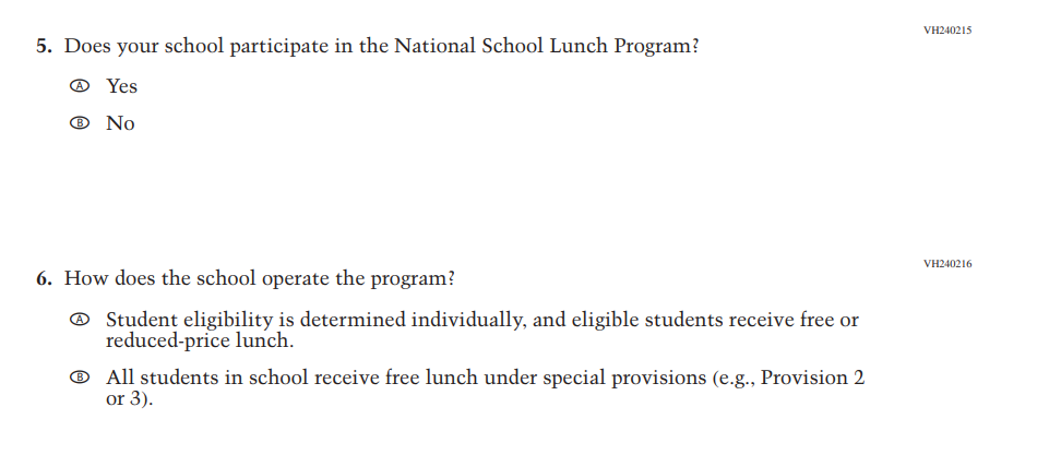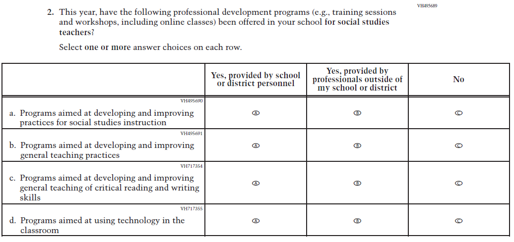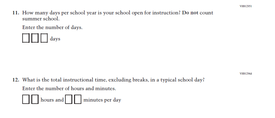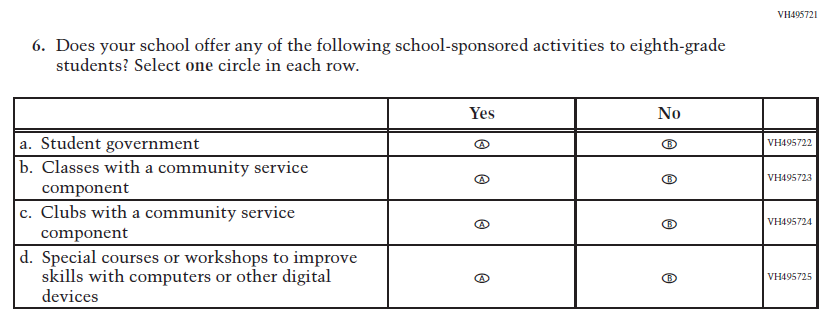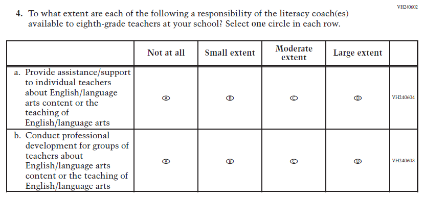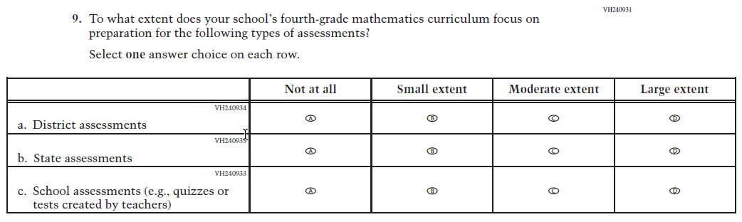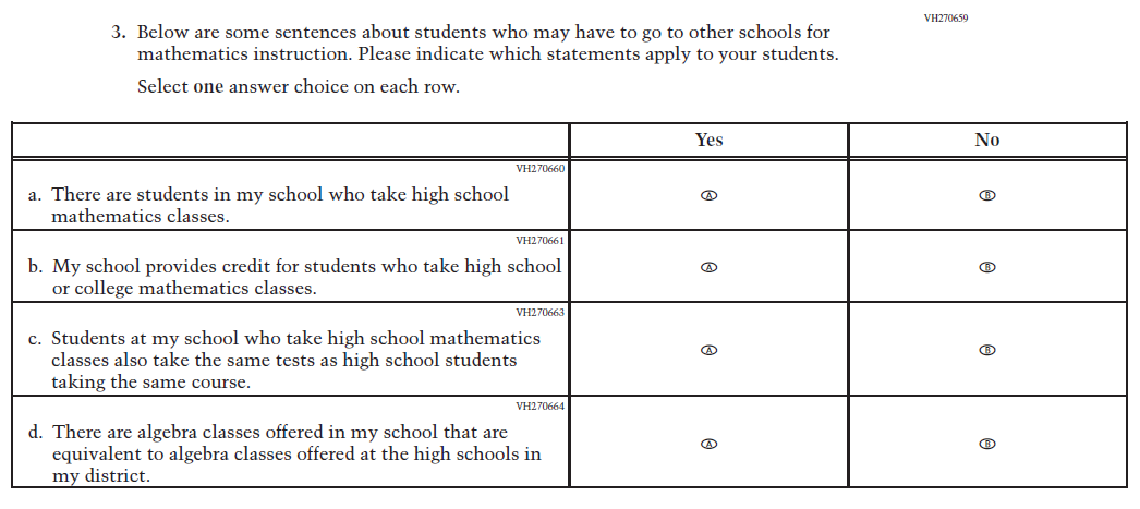 For 2026, we have aligned Inline Directions in Teacher and School Items with the Directions currently used in Student Items. Subitems a, c, and d were revised for clarity, and new subitems c and g were added to capture activities related with mathematics offered by schools. |