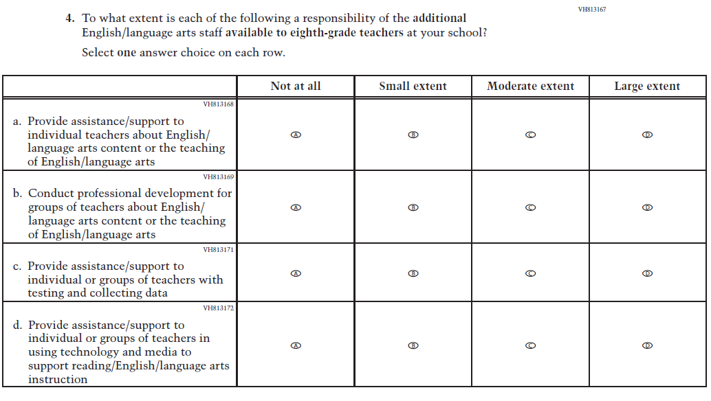 For 2026, we have aligned Inline Directions in Teacher and School Items with the Directions currently used in Student Items. Subitems a, b, d, and e were revised for clarity. |