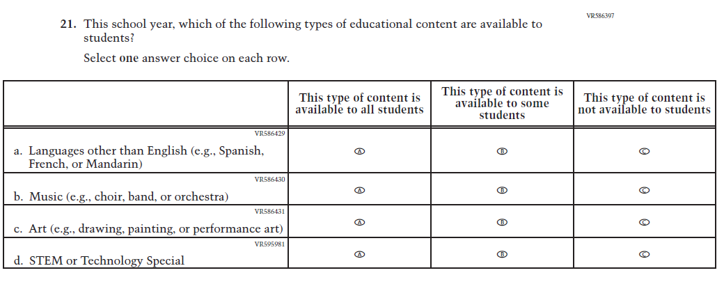 This Item was developed to measure students’ learning environments and access to educational content focused on languages, music, art, and STEM. |