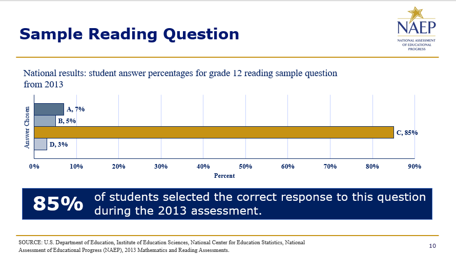 The reading framework specifies two types of texts be included on the assessment: literary and informational. The framework also specifies that vocabulary knowledge will be assessed. Vocabulary items function both as a measure of passage comprehension and as a test of readers’ understanding of how the text influences the meaning of the word. The framework also specifies three cognitive targets, or behaviors and skills, for items from both literary and informational texts: locate/recall, integrate/interpret, and critique/evaluate. To measure these cognitive skills, students respond to both multiple-choice and constructed-response items.