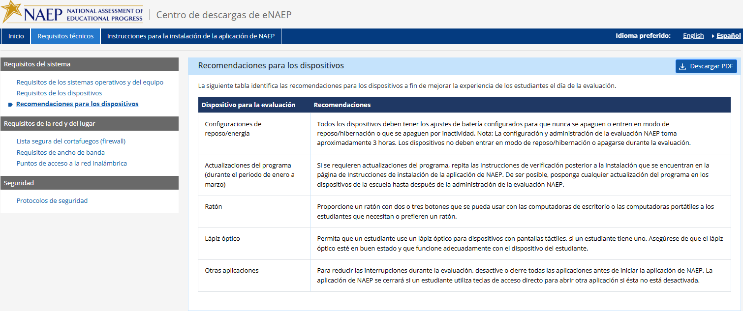 NAEP será administrada en las siguientes escuelas utilizando dispositivos de la escuela (p. ej., computadores de escritorio, portátiles, tabletas con teclado).