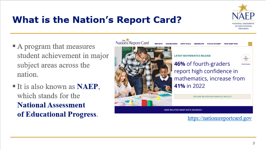 Additional information on the NAEP program and its data collection process, including health and safety protocols, is available from NAEP State Coordinators and through the NAEP website at http://nces.ed.gov/nationsreportcard.