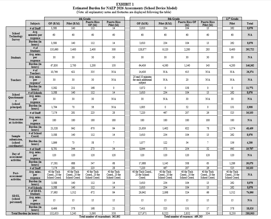 This Amendment #1 reflects updates to the NAEP 2026 Clearance package burden and budget as a result of removing the Field Trial and NCES’ decision not to administer Pilot teacher and school administrator questionnaires for grade 8 mainland U.S. and grades 4 and 8 Puerto Rico. In addition, a discrepancy in the number of schools in the school device model was corrected. These changes resulted in a slight increase in burden hours from the initial Clearance package (449,560 hours) compared to Amendment #1 (456,764 hours).