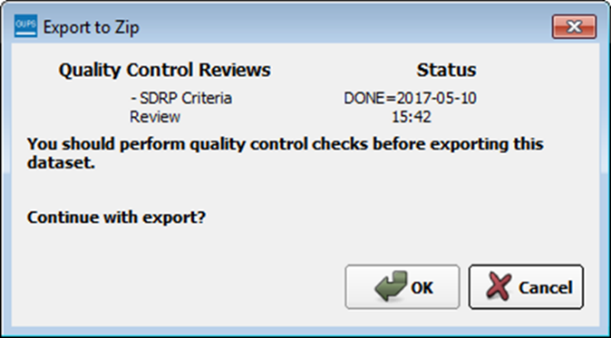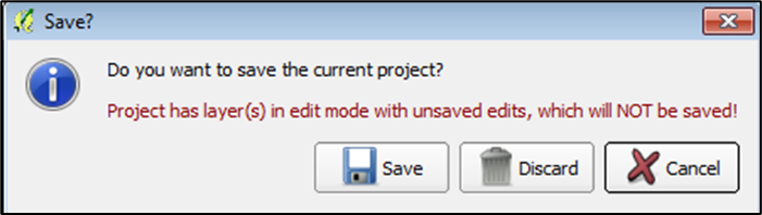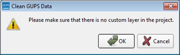 A notification appears asking the user to check that there are no custom layers in the project. Custom layers are any data in the project that is stored outside the GUPSGIS data folder, for example, a reference shapefile. Only layers stored in the GUPSGIS folder are copied through this action. Select OK.