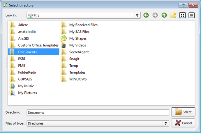 The next screen to appear is the Select Directory window. From this screen choose the location for the new working directory. In this example, the Documents folder is chosen as the new location for the GUPSGIS data folder. Choose the Select button to continue.