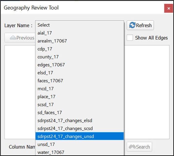 GUPS automatically loads a set of default data layers (and default layer groups) defined by the Census Bureau for the SDRP. As the map opens in Map View, the list of the preset, grouped layers appears in the Table of Contents. Participants may use the Table of Contents and Table of Contents toolbar to manage the Map View. See Figure 42 for a visual of the Table of Contents toolbar.