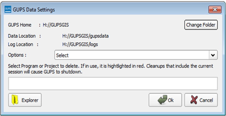 When installing GUPS, the working directory, or GUPSGIS folder, is saved by default in the home directory (typically this is the My Documents folder) unless the user specifies a different path. To change the location of the working directory after GUPS has been installed, use the Change Folder button in the GUPS Data Settings tool as described in Table 51.