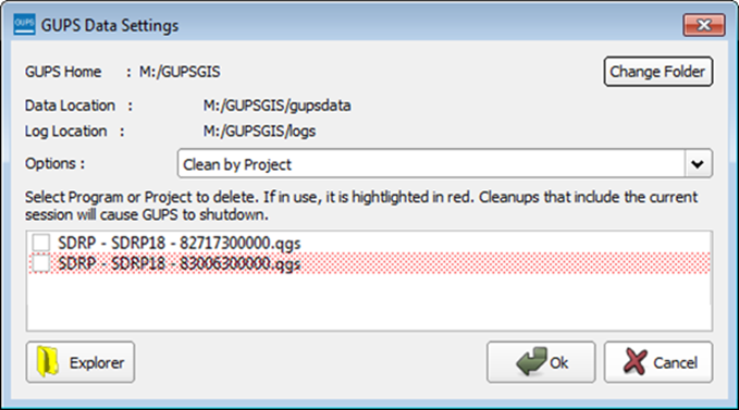 The Clean by Project (Figure 40) option allows the user to delete data/files per project. This can be useful if there is a single project that is no longer needed, or the user would like to restart the project with the original Census Bureau data. The red dotted highlighted item indicates a project that is currently in use in GUPS. To delete a project, select the checkbox next to the project then select Ok. To ensure that all data and files have been deleted, restart QGIS/GUPS by closing the program and reopening it again.