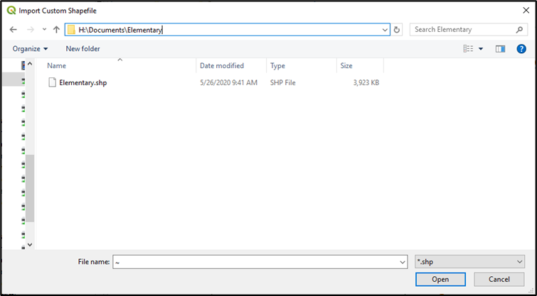 A file browser window opens. Browse to the location of the shapefile to import. Select the shapefile and then select Open.