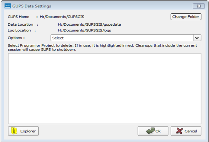 Note: All projects must be closed to change the working directory. If a project is open in GUPS, the Change Folder button is not active.