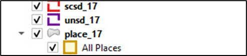 To manage visibility of individual groups or layers, check the checkbox next to a layer to make the layer visible (e.g., turn the layer on) in the Map View. Uncheck the checkbox (e.g., turn the layer off) next to a layer to make the layer invisible in the Map View. This may prove beneficial if the Map View is cluttered with too many data layers.