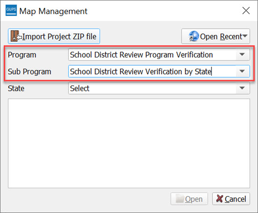 In the Map Management window, use the drop-down menu next to the Program field to select School District Review Program Verification and then select School District Review by State for the Sub Program field.