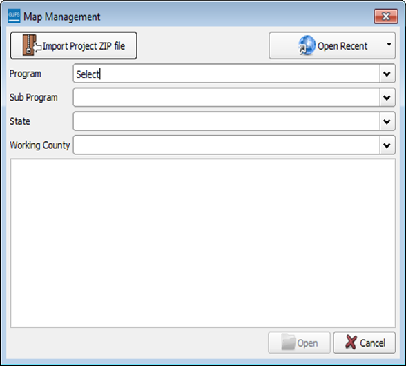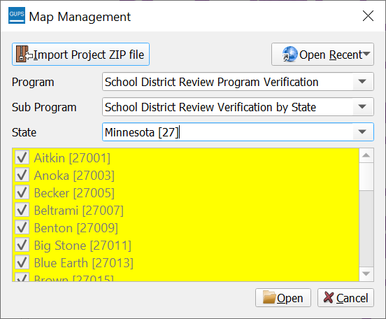 After selecting a state, GUPS refreshes the Map Management window and automatically highlights all available counties for the state of Minnesota. Select Open.