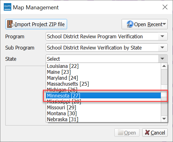 After selecting a state, GUPS refreshes the Map Management window and automatically highlights all available counties for the state of Minnesota. Select Open.