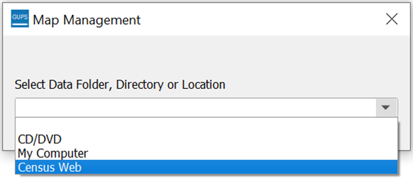 A secondary Map Management window appears to select the data source. From this secondary Map Management window, choose Census Web to download the shapefile data layers with preset symbology and labels directly into GUPS.