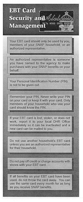 Here is a flyer that someone can get from a SNAP office. [POINT TO “EBT CARD” SECTION] Please take a few minutes to read this section and then we will talk about it. If necessary: Please remember to think aloud as you read.