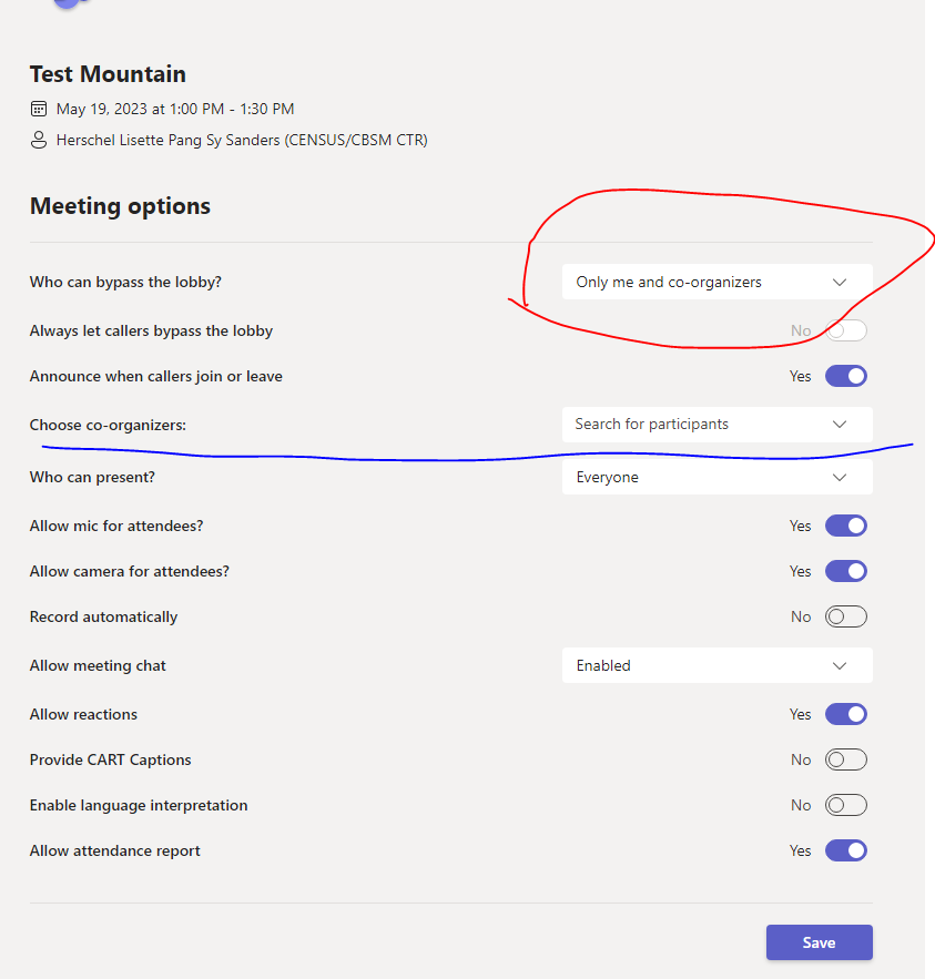 Open the invite from your calendar, click edit, go to Meeting Options, and add the moderator as a “co-organizer”, using their Census email address as they will join the meeting via the Census VDI. Click Save.