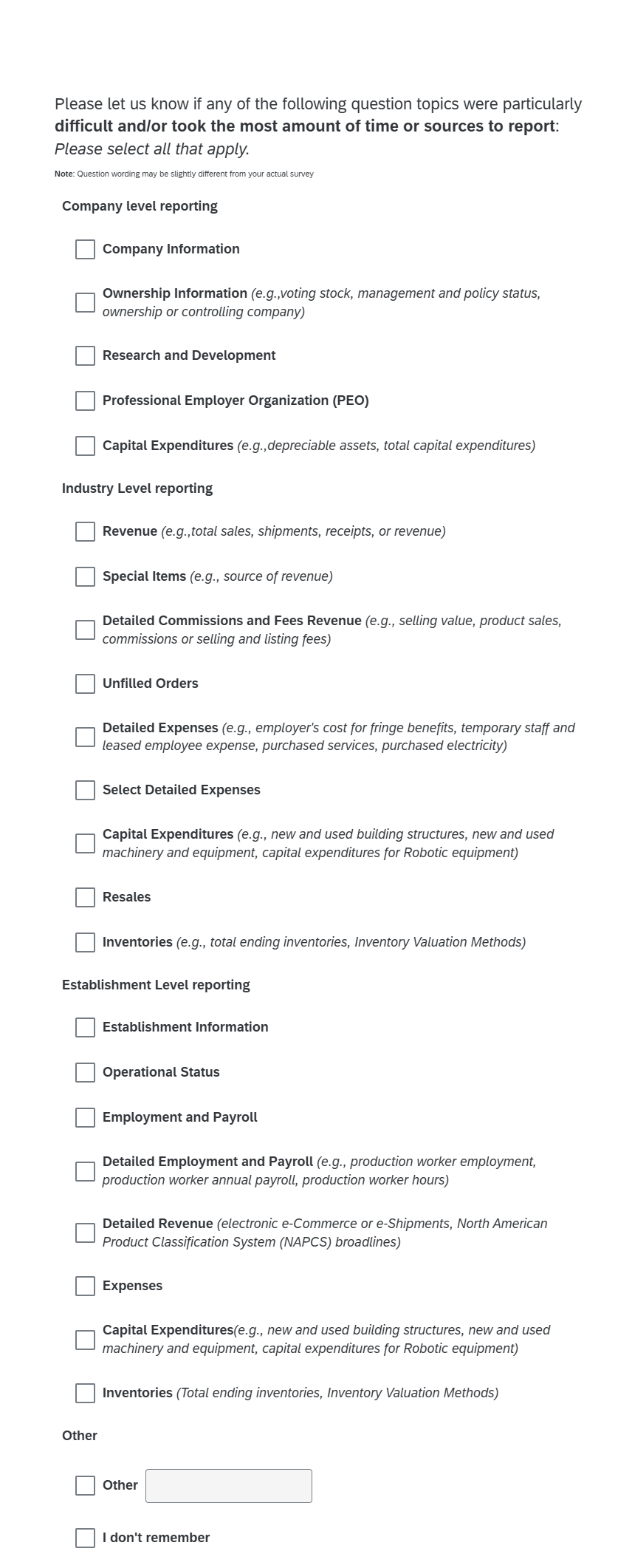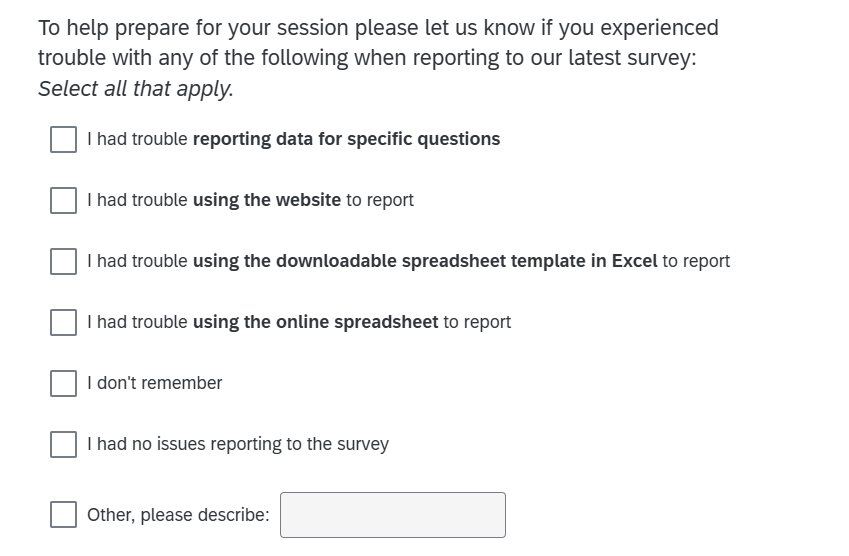 Note: If participant selects I had trouble reporting data for specific question, they will receive the following screen. To the extent possible this items listed will be based on the primary NAICS so that topics that are not applicable are not presented