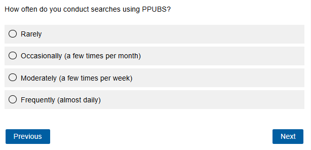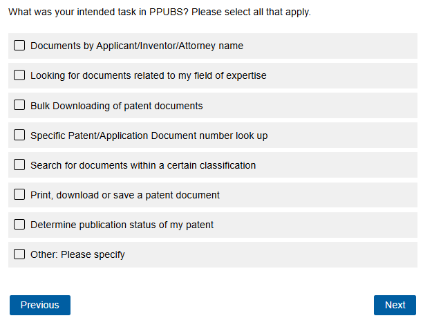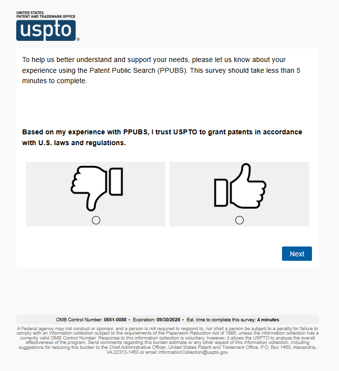 A Federal agency may not conduct or sponsor, and a person is not required to respond to, nor shall a person be subject to a penalty for failure to comply with an information collection subject to the requirements of the Paperwork Reduction Act of 1995, unless the information collection has a currently valid OMB Control Number. Response to this information collection is voluntary; however, it allows the USPTO to analyze the overall effectiveness of the program. Send comments regarding this burden estimate or any other aspect of this information collection, including suggestions for reducing this burden to the Chief Administrative Officer, United States Patent and Trademark Office, P.O. Box 1450, Alexandria, VA 22313-1450 or email InformationCollection@uspto.gov.