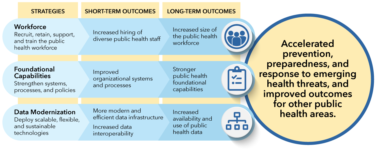 On November 29, 2022, the Centers for Disease Control and Prevention (CDC) awarded $3.2 billion to help state, local, and territorial and freely associated public health agencies across the U.S. strengthen their public health workforce and infrastructure through the Public Health Infrastructure Grant (PHIG). This grant provides 107 jurisdictions (Component A recipients) with disease-agnostic funding to support public health infrastructure needs. The three grant strategies are Strategy A1: Workforce; Strategy A2: Foundational Capabilities; and Strategy A3: Data Modernization. The priority short-term outcomes recipients are expected to achieve by the end of the five (5)-year period of performance include: (1) Increased hiring of diverse public health staff and (2) Improved organizational systems and processes, among other outcomes. In the long term, expected outcomes include: (1) Increased size and capabilities of the public health workforce; (2) Stronger public health foundational capabilities; (3) Increased availability and use of public health data; and (4) Improved sharing of lessons learned.