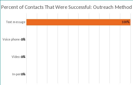 | N100047 | Active (Odds) | 7/7/2021 | OC | Mentor | Scheduled | Text message | Small group | Successful | Weekly check-in |