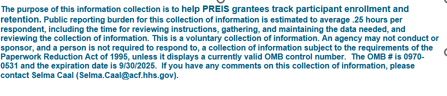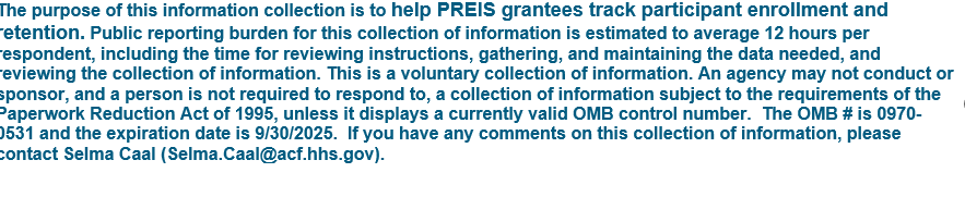 The purpose of this information collection is to help PREIS grantees develop data analysis plans. Public reporting burden for this collection of information is estimated to average 12 hours per respondent, including the time for reviewing instructions, gathering, and maintaining the data needed, and reviewing the collection of information. This is a voluntary collection of information. An agency may not conduct or sponsor, and a person is not required to respond to, a collection of information subject to the requirements of the Paperwork Reduction Act of 1995, unless it displays a currently valid OMB control number. The OMB # is 0970-0531 and the expiration date is 9/30/2025. If you have any comments on this collection of information, please contact Selma Caal (Selma.Caal@acf.hhs.gov).