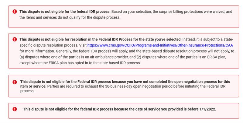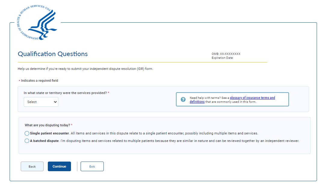 Before continuing we'd like to ask you a series of quick questions to confirm your eligibility for the payment dispute process. This process allows health care providers, plans, and issuers to resolve payment disputes. If you're an uninsured patient, self-paying patient, or insured patient visit https://www.cms.gov/nosurprises.