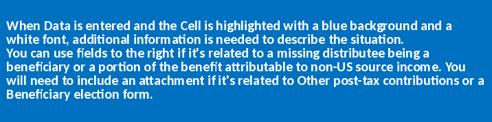 Use these color indicators when reviewing your filing spreadsheet to insure you have included all the necessary data and descriptions. |