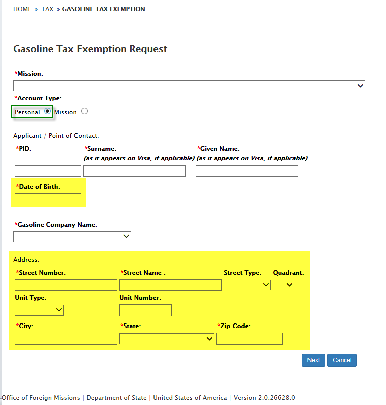 Data items collected by the eGov Gasoline Tax Exemption request but not collected by the DS-99 Form;