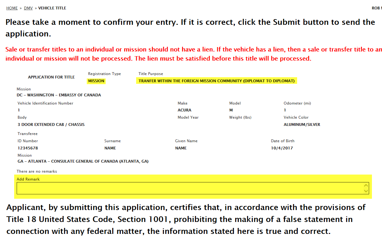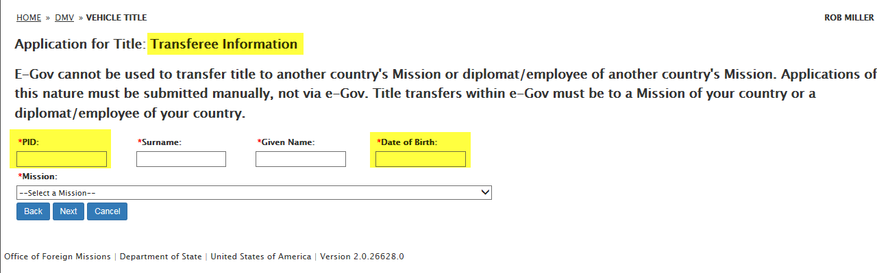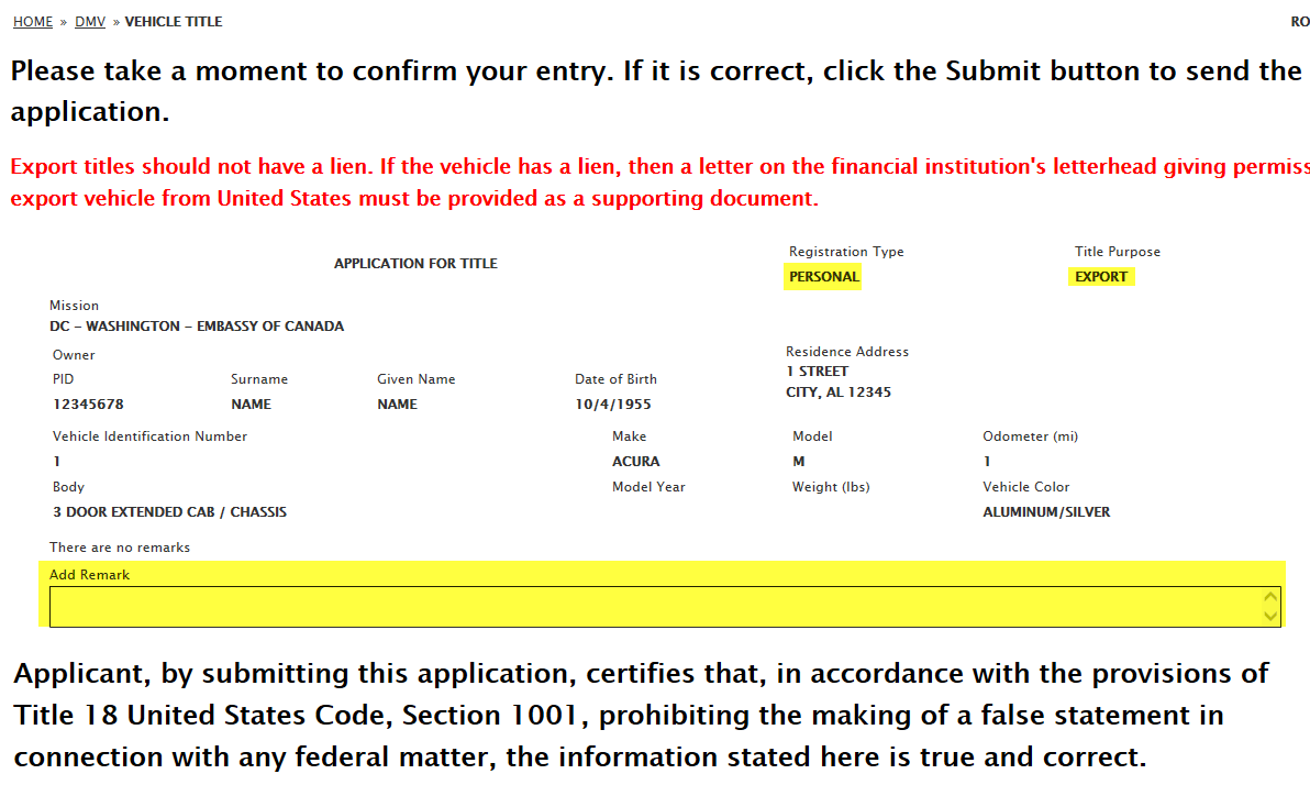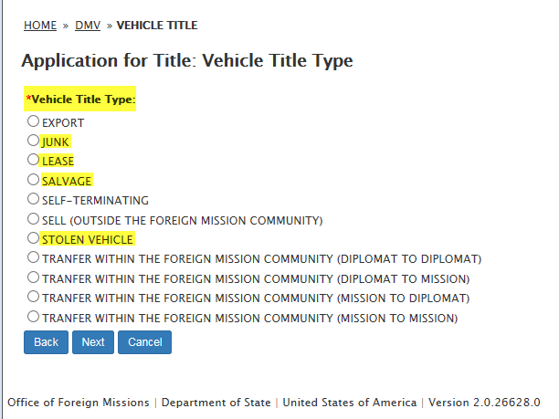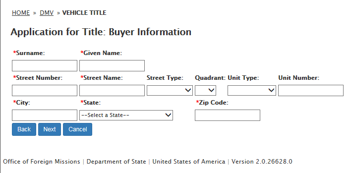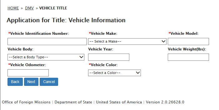 DS-102 Form / Application for Vehicle Title Request: eGov pages