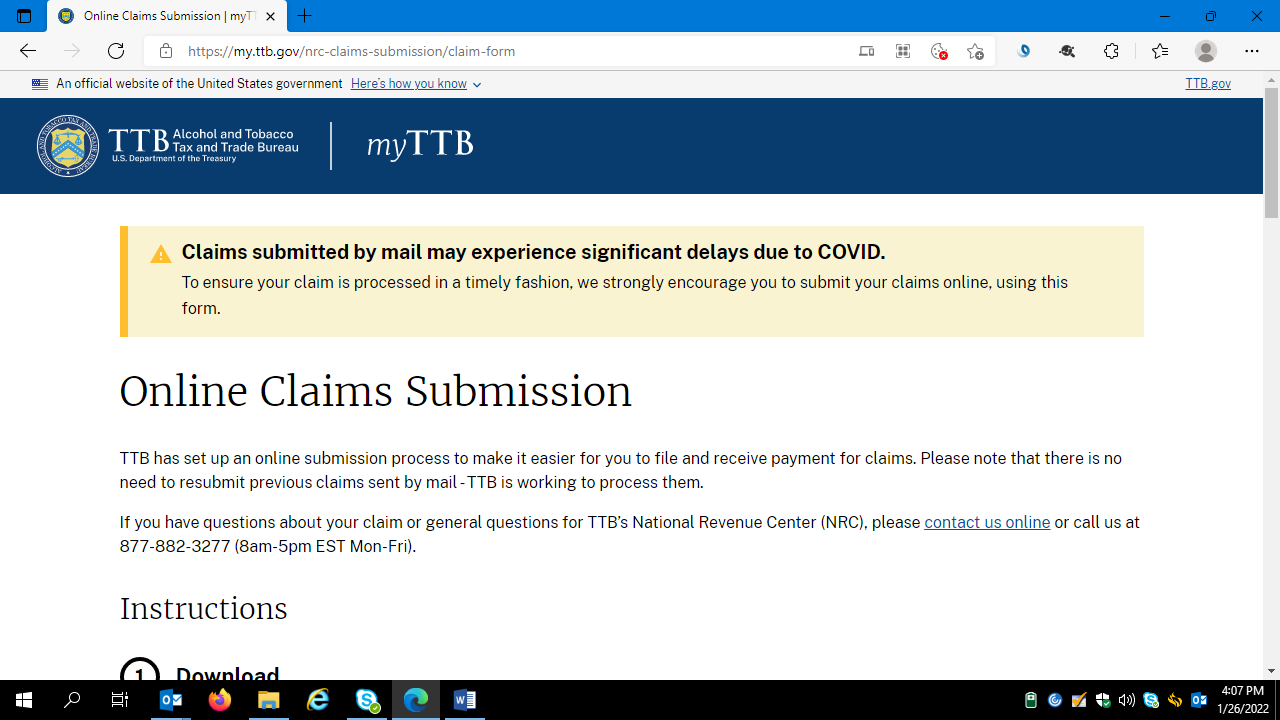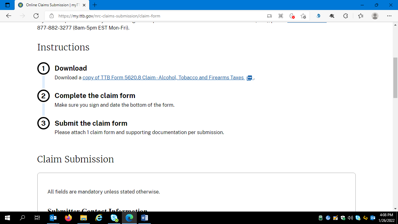 After downloading and completing a fillable-printable TTB F 5620.8 form from the TTB website (https://www.ttb.gov/forms), respondents may electronically upload and submit the completed form and any required supporting documents to TTB via the Online Claims Submission portal on the TTB website at https://my.ttb.gov/nrc-claims-submission/claim-form.